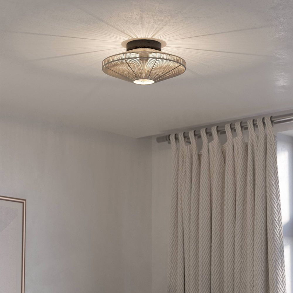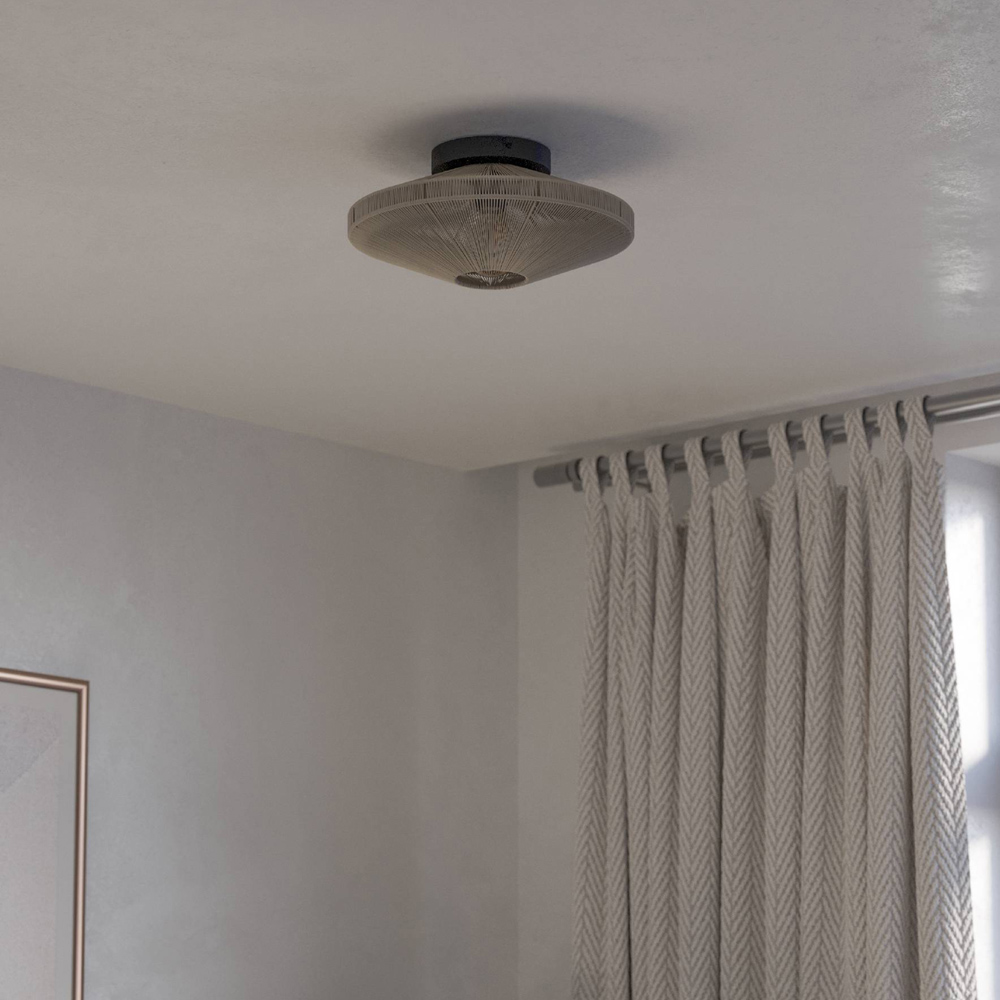 The Midsummer ceiling light features a timeless design, blending vintage charm with modern functionality. Its 380mm diameter shade, crafted from durable black steel, is complemented by a sophisticated cream-coloured fabric diffuser, adding a touch of elegance to any space. Standing at 175mm in height, this indoor fixture offers warm illumination via an E27 socket (40W bulb not included). With an IP20 rating, it's perfect for creating a cosy atmosphere in living rooms and bedrooms alike. A lightbulb is required and sold separately.