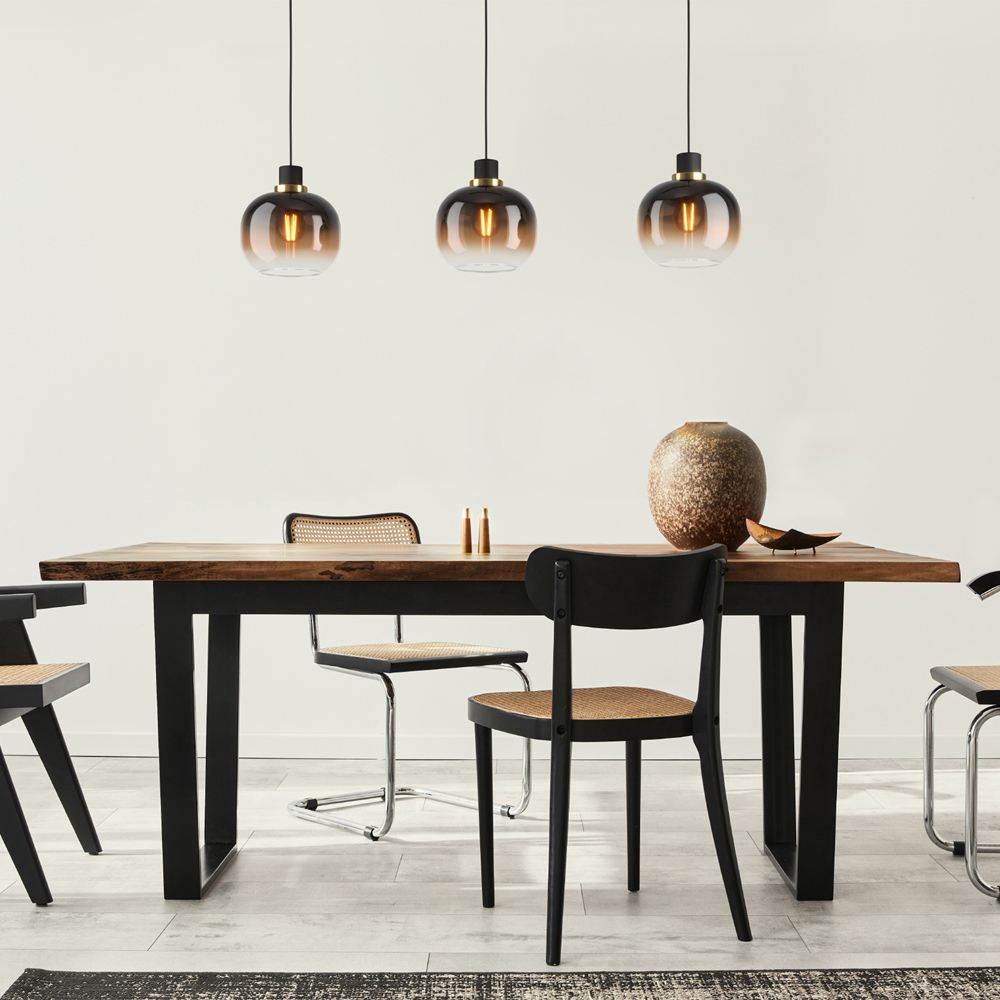 Elevate your home's ambience with the OILELLA pendant light. Its three spherical, vaporised glass shades boast a striking black and brown palette, each accented with sleek black steel and a brushed brass decorative element. This earthy design seamlessly complements any interior, adding warmth and style whether it graces your living room or hangs above your dining table. The fixture uses three E27 bulbs (not included).