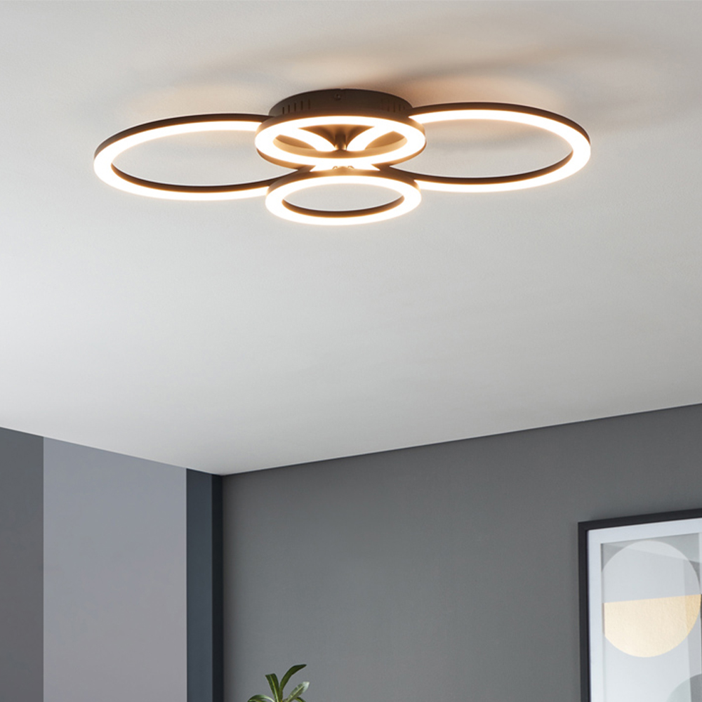 The Eglo Parrapos-Z ceiling light offers a modern, minimalist design perfect for contemporary interiors. Its 45cm frame features four round black LED profiles—two large and two small—mounted on a central round steel base. Integrated LEDs, positioned behind white plastic light panels, provide adjustable lighting: warm white, neutral white, or cool white. Control is effortless via the free AwoX HomeControl app, enabling brightness adjustment, timer functions, and presence simulation. Bluetooth and Zigbee 3.0 compatibility allow for voice assistant integration.