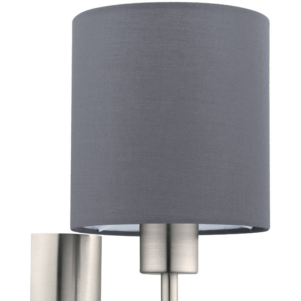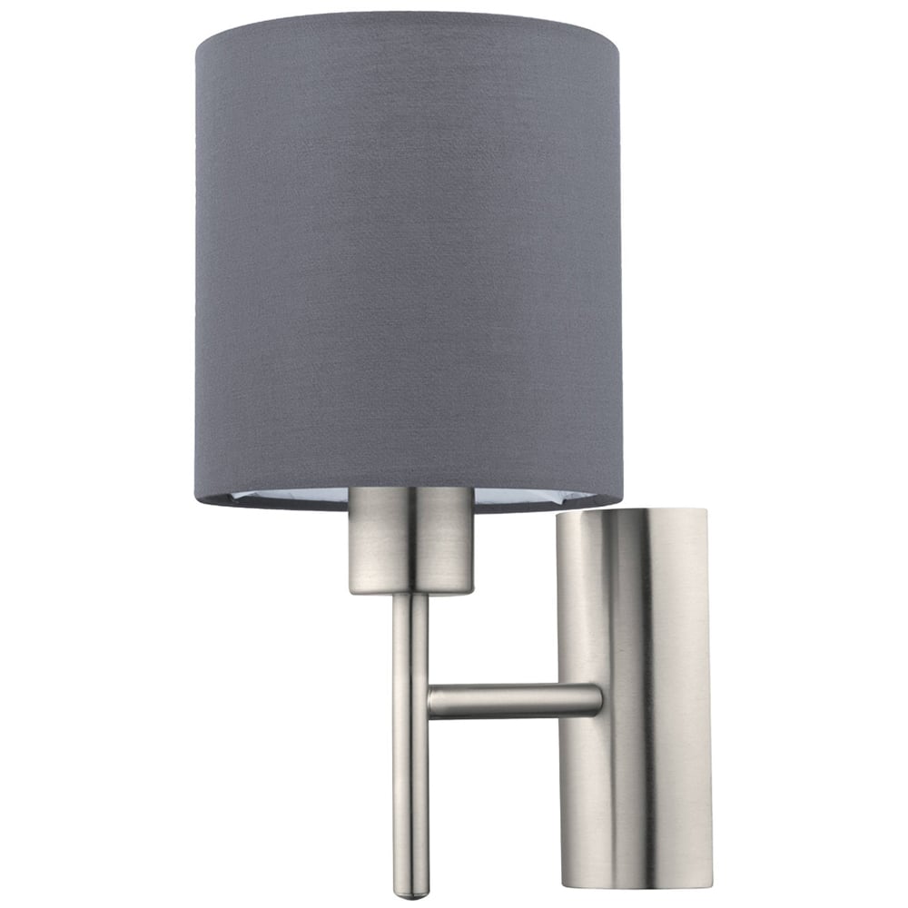 Enhance your home's ambiance with the PASTERI wall light. This stylish fixture boasts a sleek matte nickel finish and a soft grey fabric shade, creating a warm and inviting glow. Its simple design seamlessly integrates into various interiors, perfect for bedrooms, living rooms, or hallways. The integrated rocker switch offers easy operation. To complete the look, simply add an E27 lightbulb (not included).