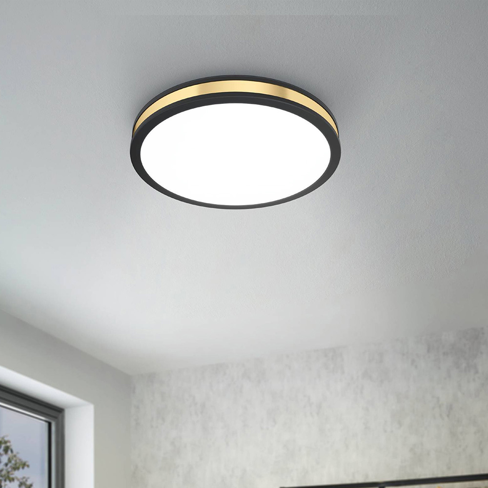 Elevate your home's style with the EGLO Pescaito LED ceiling light. Its black metal frame is accented with a gold-coloured plastic detail, creating a sophisticated contrast. Integrated LEDs, softened by a white plastic cover, emit a warm white light, offering both energy efficiency and cost savings. This compact design seamlessly complements various interior styles, making it perfect for living rooms, bedrooms, hallways, or dining rooms, especially in UK homes with low ceilings. Dimensions: H65 x D280mm.