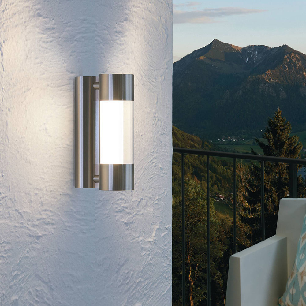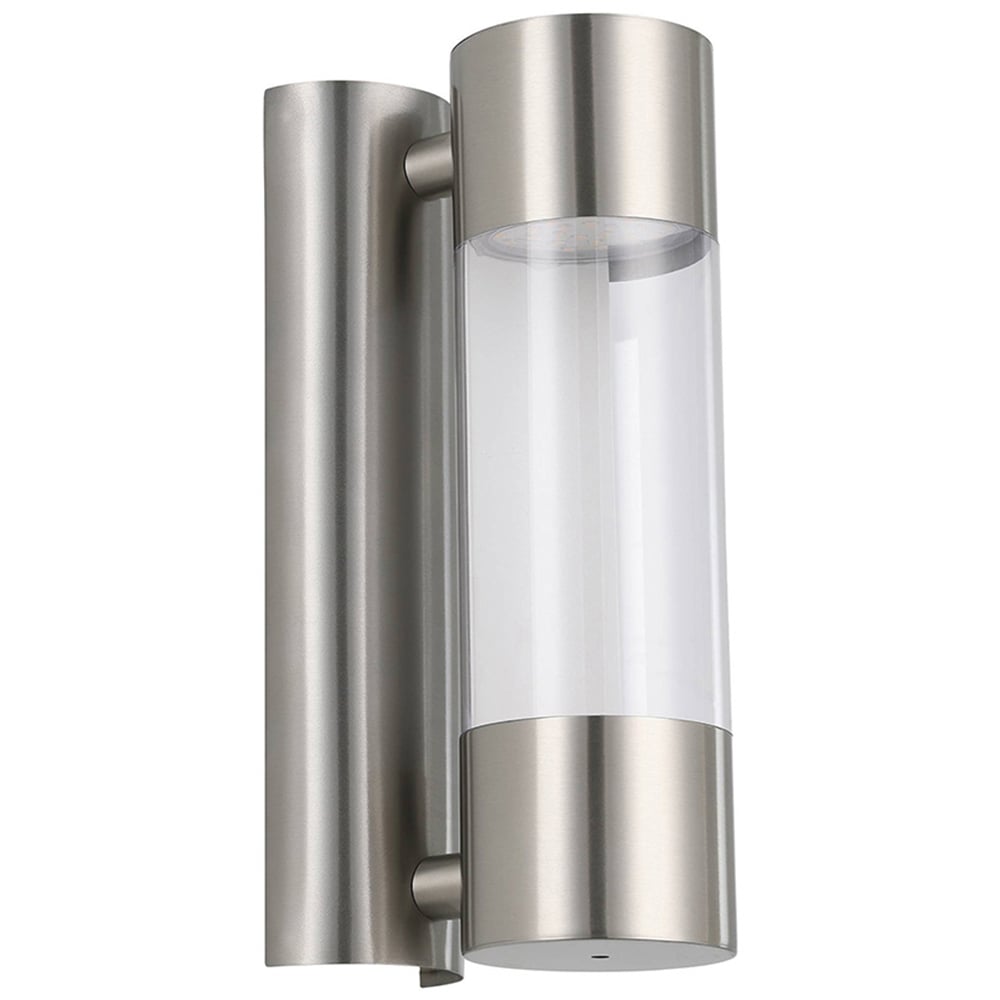 The Robledo is a stylish cylindrical exterior wall light crafted from stainless steel with a clear plastic light panel at its centre. Integrated LEDs in the upper and lower sections of the panel emit a warm white light. Its IP44 rating ensures suitability for outdoor use, providing elegant indirect lighting for house walls, entrances, terraces, or balconies.