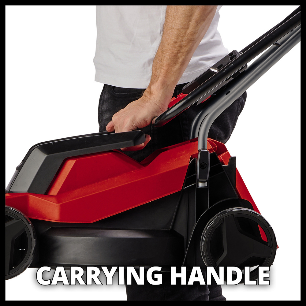 Crafted for convenience, the mower features a foldable guide rail for space-saving storage, making it easy to store in compact spaces. The 30-litre grass collection box ensures efficient grass disposal, while the robust folding push handle, made from powder-coated steel, provides durability and comfort during use. An integrated carrying handle simplifies transport, allowing for effortless movement from storage to your lawn. Enjoy a well-manicured garden with this reliable and practical electric lawn mower.