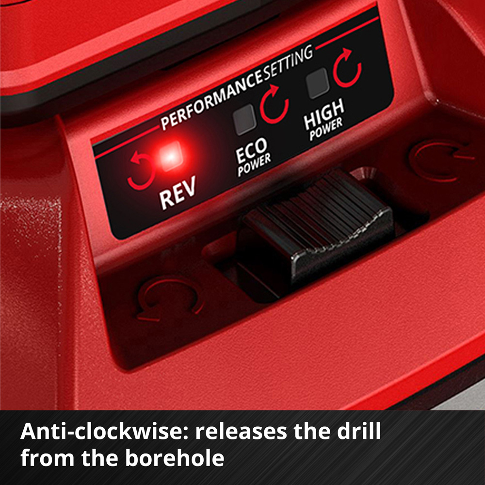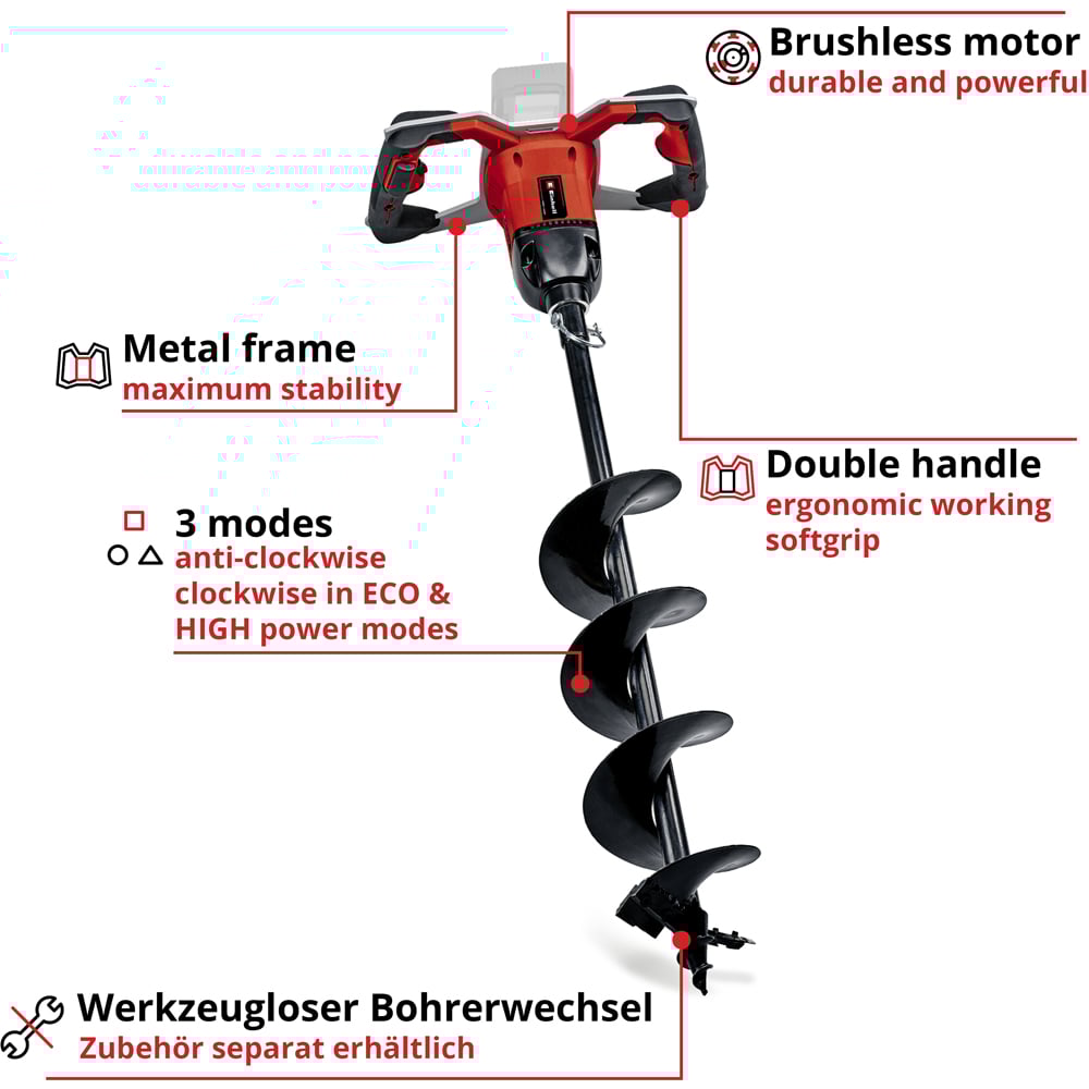 Effortlessly cultivate your garden with the GP-EA 18/150 Li BL-Solo cordless auger. Ideal for planting, setting fence posts, digging small foundations, or other gardening tasks, this powerful tool is a gardener's best friend. The kit includes an 80cm long, 15cm diameter auger attachment. Part of the Einhell Power X-Change family, it uses high-quality lithium-ion battery cells compatible with other system devices (battery and charger sold separately, requires a PXC 18V battery). A PurePOWER brushless motor delivers increased power and runtime compared to brushed motors, backed by a 10-year warranty after online registration. A robust aluminium gearbox housing and three adjustable settings—counter-clockwise for release, clockwise ECO for soft ground, and clockwise HIGH for hard surfaces—ensure optimal performance. Ergonomic work is guaranteed thanks to the double handle with softgrip, and the sturdy metal frame provides maximum stability and torsional stiffness.