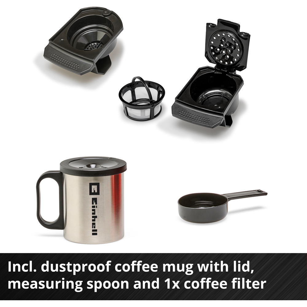 The Einhell TE-CF 18 Li-Solo cordless coffee maker lets you savour freshly brewed coffee wherever you are. This Power X-Change system device is compatible with all system batteries and chargers. Brew filter coffee or use coffee pads in about 5 minutes. It features a removable 240ml water tank and includes a dustproof stainless steel coffee cup with a lid. Lightweight and portable, with a convenient carrying handle, it',s perfect for taking your coffee on the go. Rubber feet keep it stable. Accessories include a measuring spoon, a ground coffee container with filter, and a coffee pad holder. Battery and charger are not included.