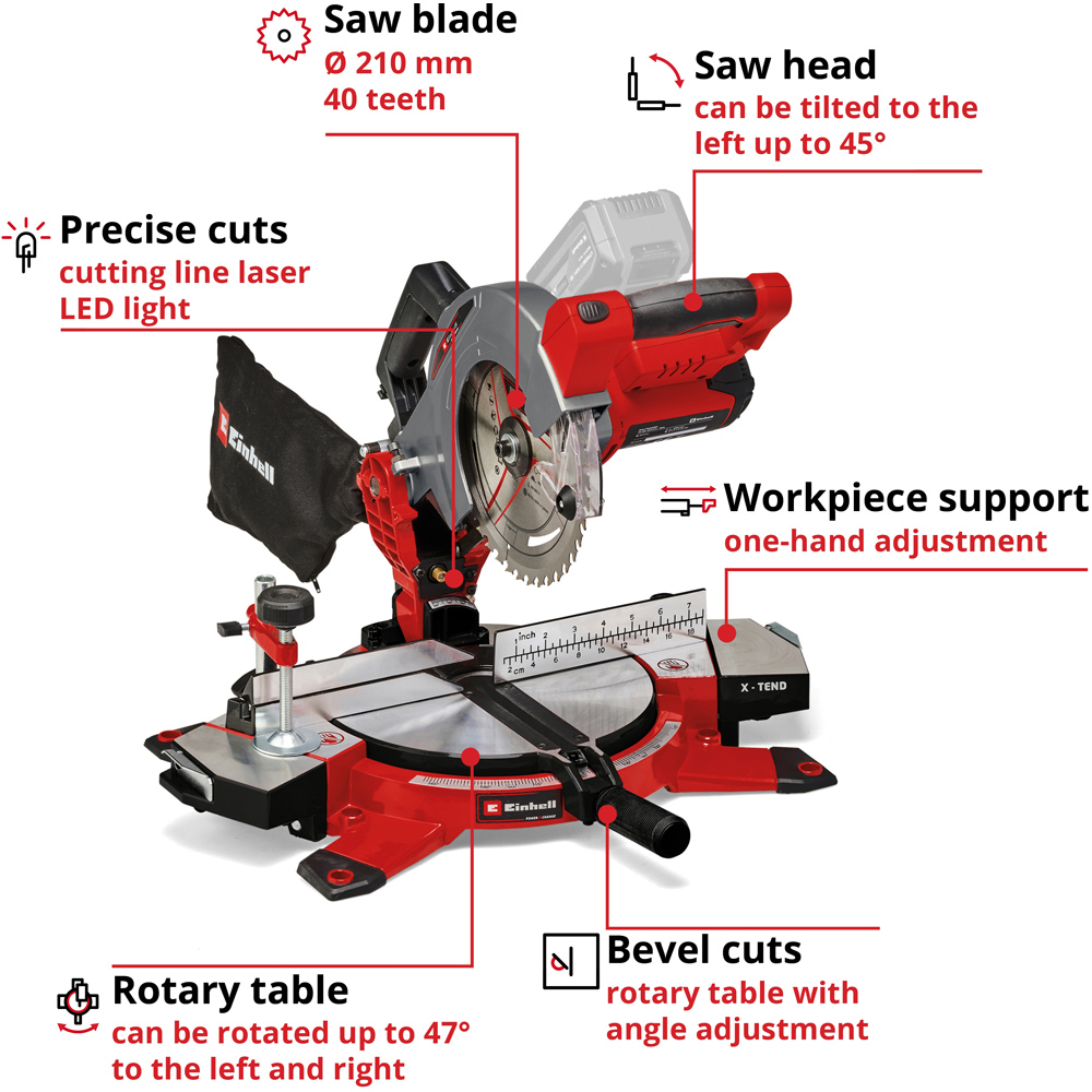 Unleash effortless cutting with the Einhell TE-MS 18/210 Li – Solo cordless crosscut saw. This compact and portable saw is ideal for both home and workshop projects. Freedom from power cords, as part of the Power X-Change system, allows for unlimited range. Precision is key with its adjustable turntable, tiltable saw head for miter cuts, laser cutting line, LED light, and workpiece clamp. The X-Tend supports adjust easily without tools, and a limit stop ensures accurate repeat cuts. A carbide-tipped precision saw blade, designed specifically for cordless use, and an integrated sawdust bag maintain a clean workspace. Note that batteries and chargers are sold separately.