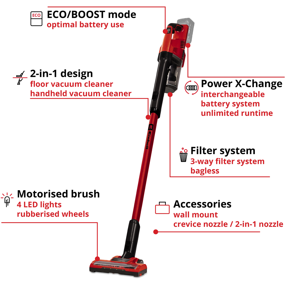 Effortlessly clean your home with the Einhell TE-SV 18 Li-Solo cordless upright vacuum. Part of the Power X-Change battery system (18V battery required, sold separately), it offers cable-free cleaning for ultimate convenience. Swap out depleted batteries for fully charged ones for uninterrupted cleaning. A 6Ah battery delivers up to 80 minutes of runtime in ECO mode. Four LED spotlights and a two-axis adjustable floor nozzle illuminate and access hard-to-reach areas. Rubberised wheels ensure quiet operation and protect delicate floors.