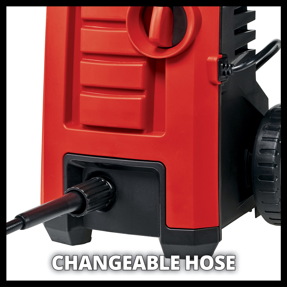 This Einhell TC-HP 130 high-pressure cleaner delivers 1,500 W of power for effective high-pressure cleaning. Its compact design, coupled with a central carrying handle, ensures ease of use and space-saving storage. Ideal for mobile applications thanks to its low weight, this cleaner is perfect for swiftly removing light dirt, boasting a high flow rate. The integrated filter on the water connexion ensures clean operation.