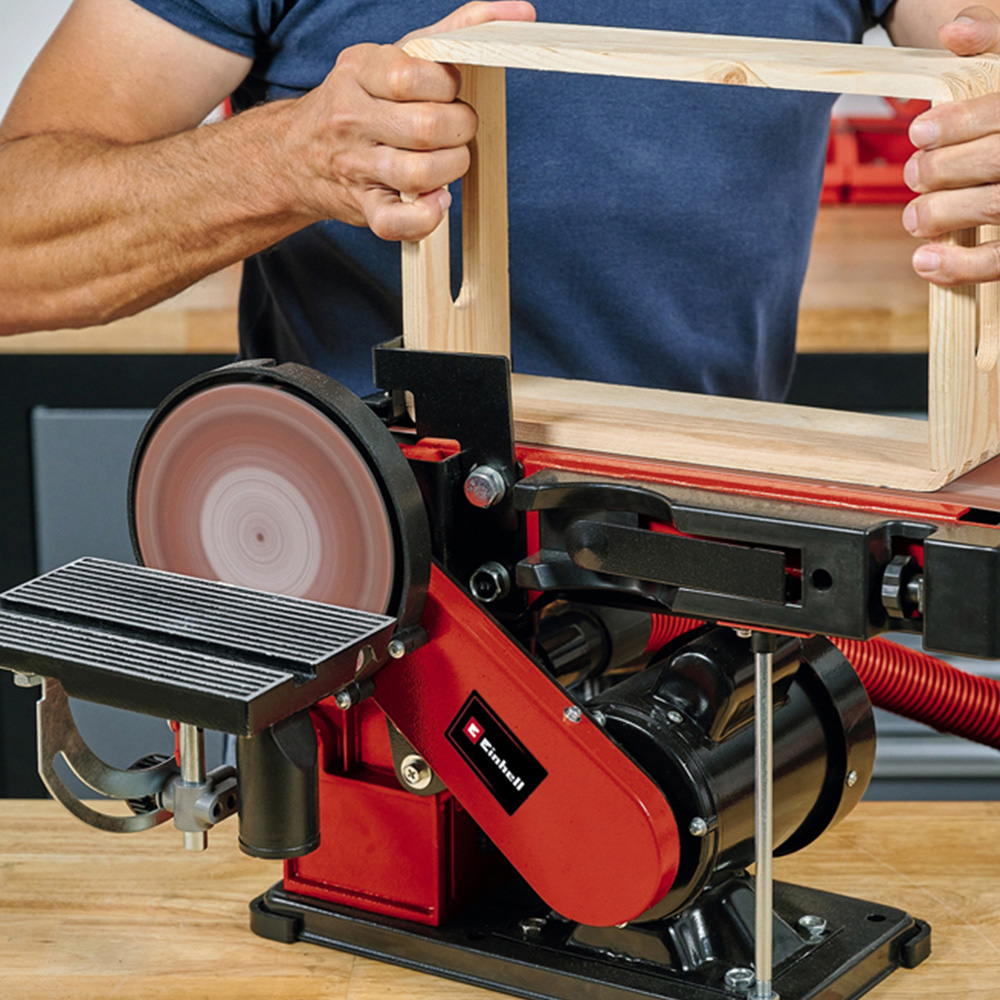 The Einhell TC-US 380 is a powerful 380W belt and disc sander, ideal for a variety of sanding and finishing tasks. Effortless operation is ensured by the pivotable belt sanding device with workpiece stop, and a clamping device featuring abrasive belt centring and hook and loop disc fastening. The sturdy, tiltable aluminium support table, usable with both sanding devices, offers stability and features an angle scale for precise work. A versatile transverse stop pivots from -60° to +60°. Four rubber feet provide vibration dampening and stability, while the integrated dust extraction connexion maintains a clean workspace. Sanding belt and disc sandpaper are included.