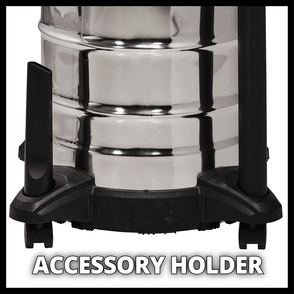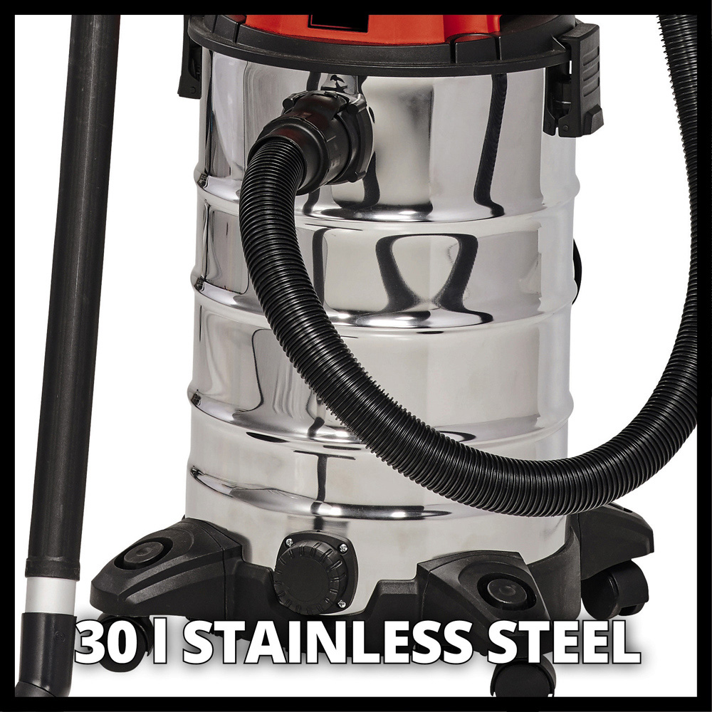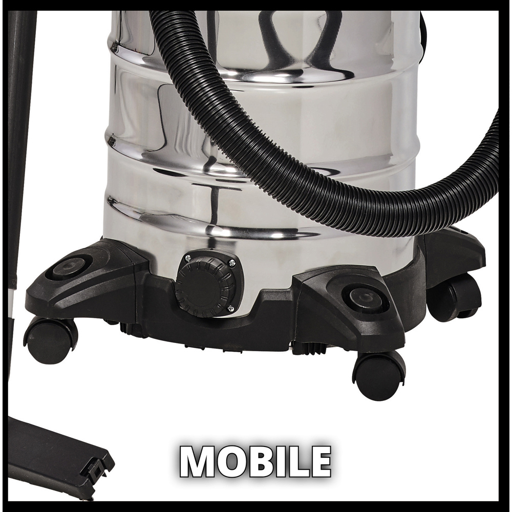 Unleash the cleaning power of the Einhell TC-VC 1930 S wet and dry vacuum cleaner. This robust machine boasts a powerful 1500W motor, tackling even the toughest cleaning tasks with ease. Its substantial 30-litre stainless steel tank, resistant to rust and built to last, handles large volumes of dirt and water. Emptying the tank is effortless thanks to the integrated water drain screw. Reach those hard-to-clean spots with the handy blow function, ideal for clearing debris from awkward areas. Four sturdy castors provide excellent mobility, while the integrated accessory and cable holders keep everything organised. Included are a 2.5m (36mm diameter) plastic suction hose for optimal airflow, a two-piece extension tube, floor nozzle, crevice nozzle, foam filter, and pleated filter.