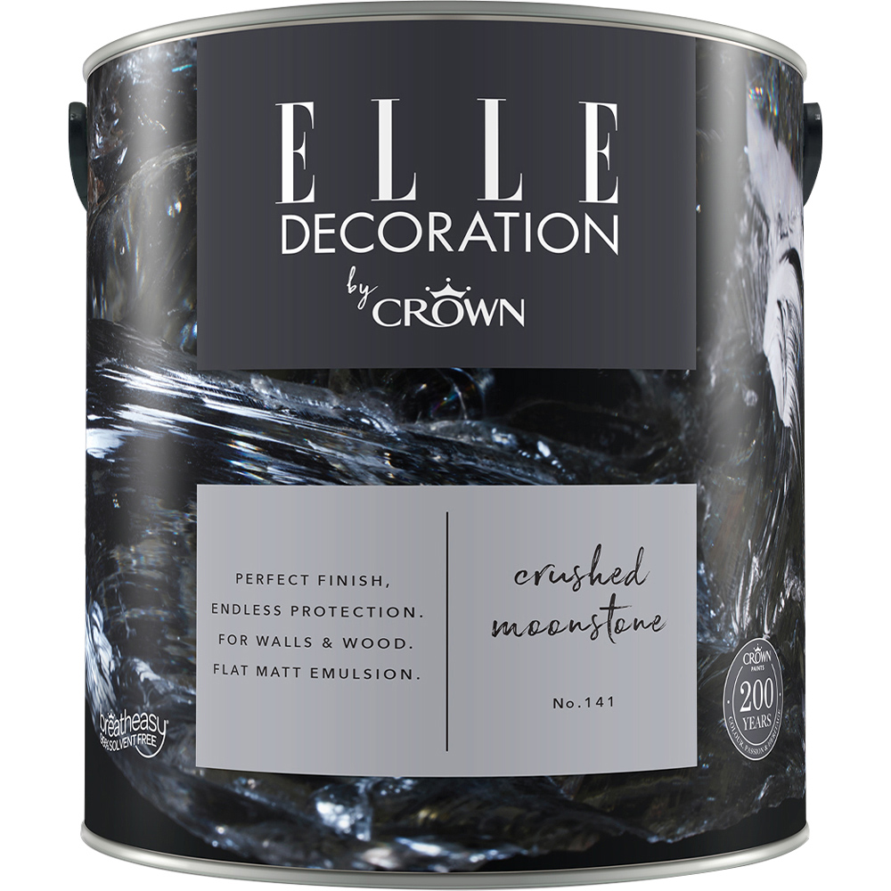 Transform your interior with Elle Decoration Crushed Moonstone 141 Flat Matt Emulsion Paint. This premium 2.5L emulsion is perfect for interior walls and wood, boasting Crown',s unique Breatheasy® formulation. Part of a stylish and durable range, this soothing mid-grey (Crushed Moonstone No. 141) offers exceptional resilience. Significantly more washable and 200 times tougher than standard paints, it effortlessly wipes clean, resisting marks and stains.