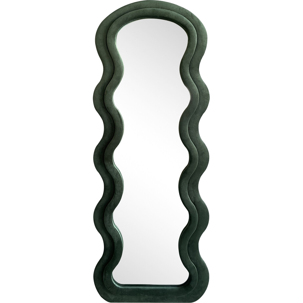 Elevate your space with this emerald green full-length mirror (160 x 61cm). Its eye-catching wave-effect edge and luxurious velvet-effect frame add a touch of modern opulence to any room – bedroom, hallway, or living room. The generous 160cm height ensures you'll always have a perfect view, while the textured frame brings warmth and cosiness to your home.