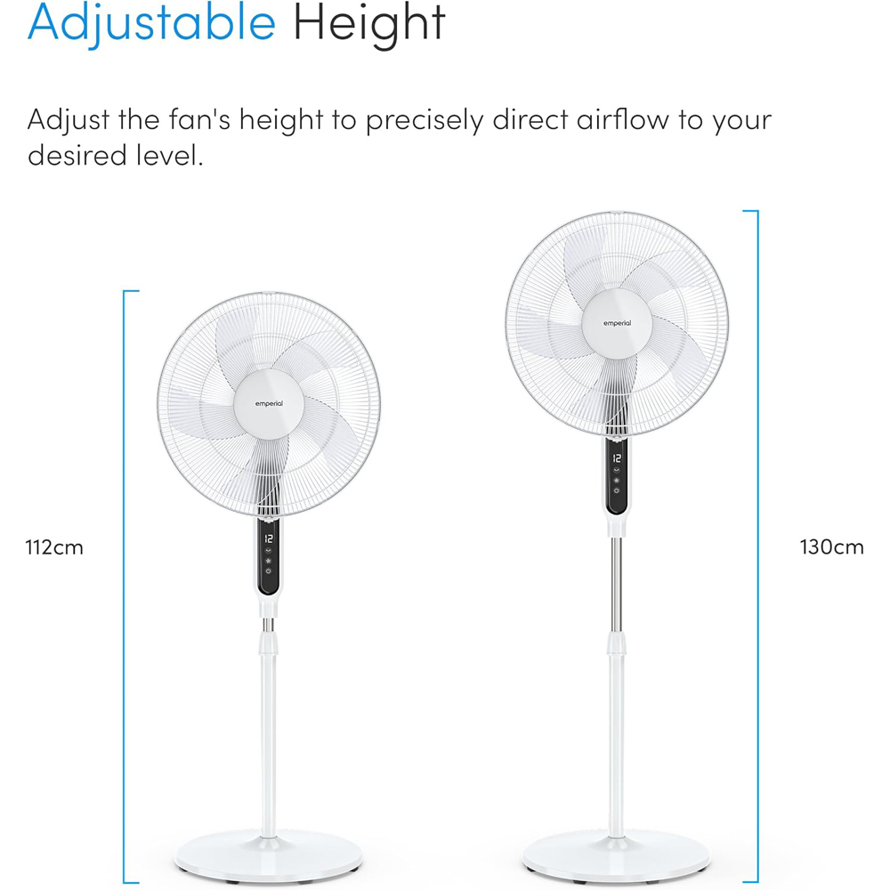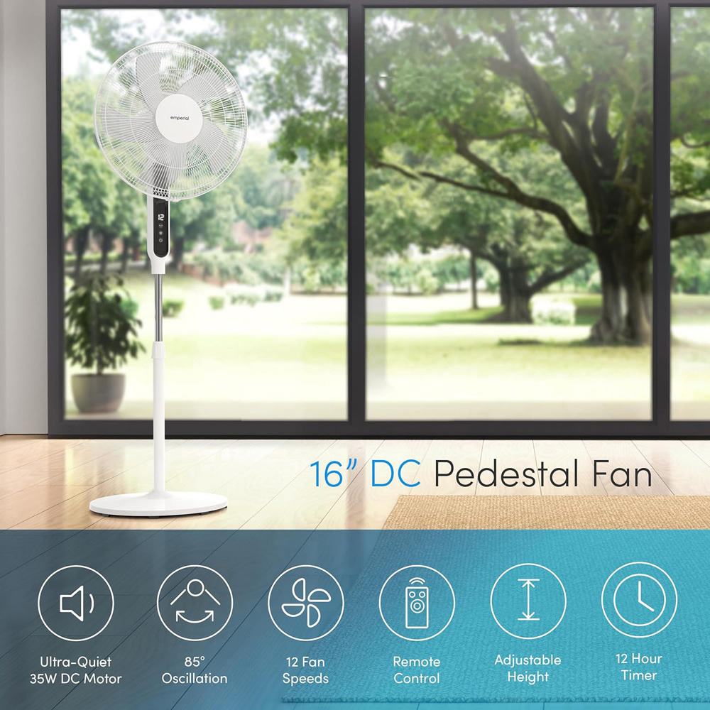 Enjoy a refreshing breeze with the Emperial 16" Pedestal Fan. Featuring a wide 85° oscillation and adjustable height and tilt, you can direct the cool airflow precisely where you need it. With 12 speeds and 5 strong blades, this fan offers a range from a quiet, gentle breeze to ultra-powerful room cooling, accelerating airflow for greater coverage. An included remote control allows for convenient setting adjustments from across the room.