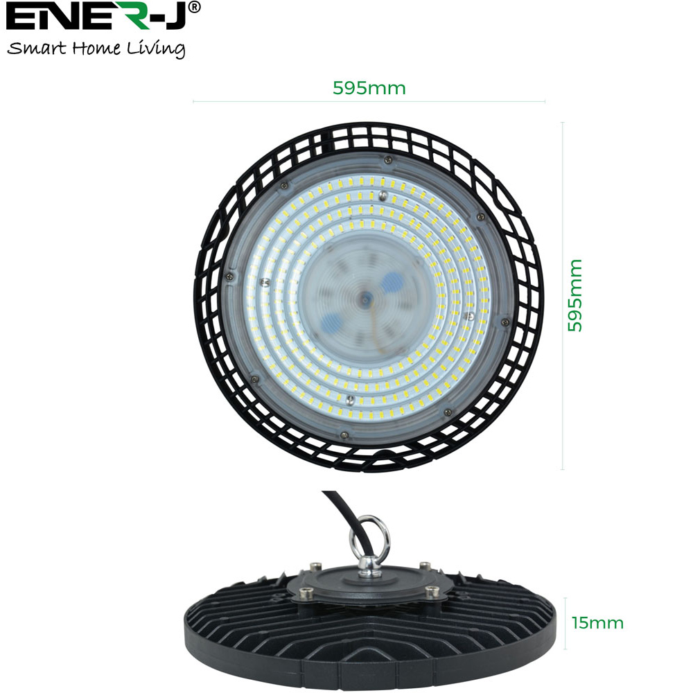 Illuminate your warehouse or high-ceiling space with the ENER-J 100W 4000K UFO LED High Bay. This high-performance light delivers 100 lumens per watt, creating a bright, productive environment. Boasting a lifespan of up to 20,000 hours and a two-year warranty, its durability is assured. The IP65 rating provides dust and water protection, ideal for various industrial settings. Save up to 60% on energy costs compared to traditional bulbs, without sacrificing brightness. Installation is simple thanks to the included one-meter cable.
