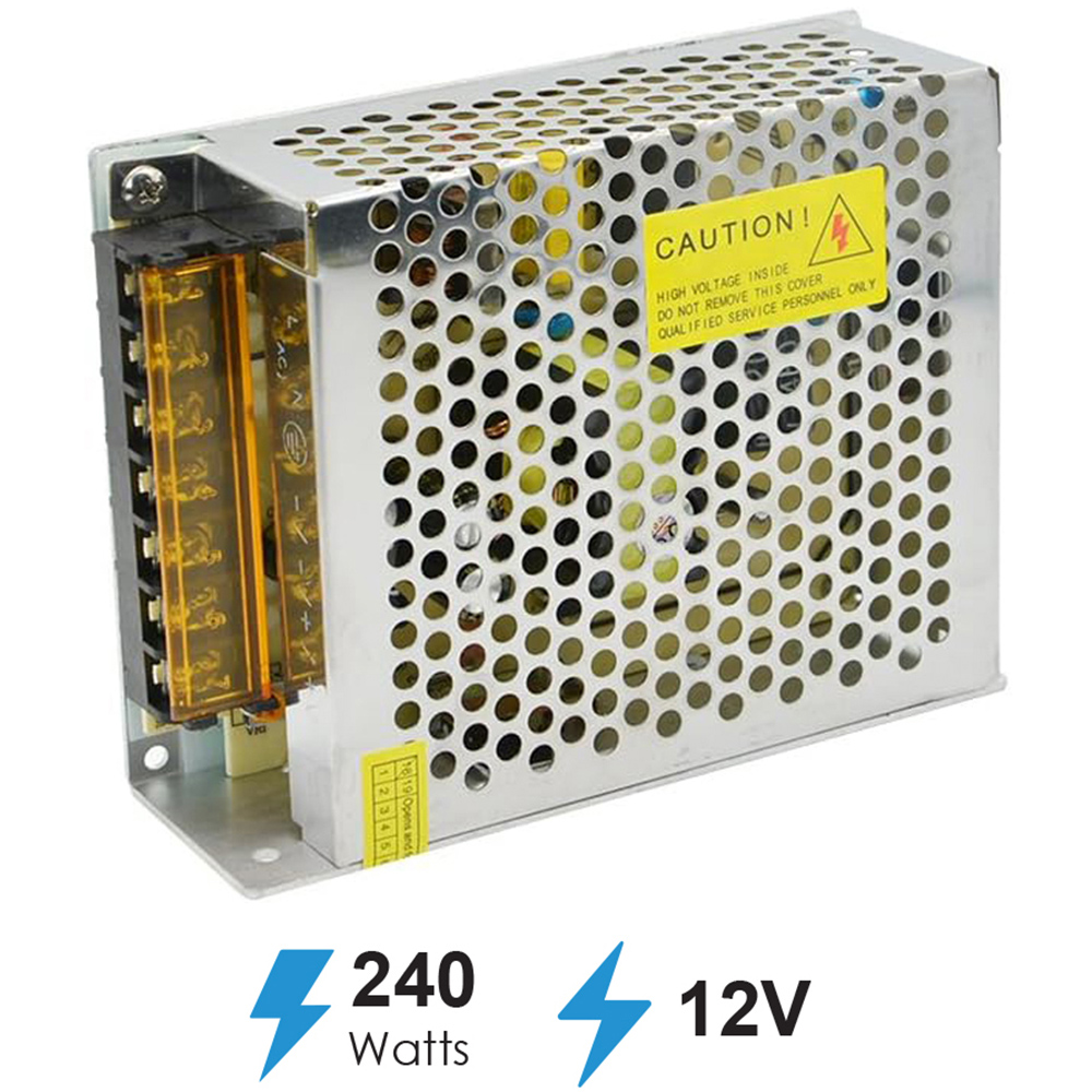 The Ener-J 12V 20A 240W DC Metal Power Supply Driver provides a stable and efficient power solution for your LED lighting and other applications. This robust switching-mode power supply (SMPS) converts 175-240V AC input to a steady 12V DC output, delivering a maximum power of 200W and a current of 16.7A. Its durable metal case ensures excellent heat dissipation, enabling silent operation without the need for a fan. Comprehensive safety features include automatic protection against short circuits, overload, over-voltage, over-temperature, and inrush current. Perfect for powering LED lighting, electronic equipment, security cameras, and home appliances.