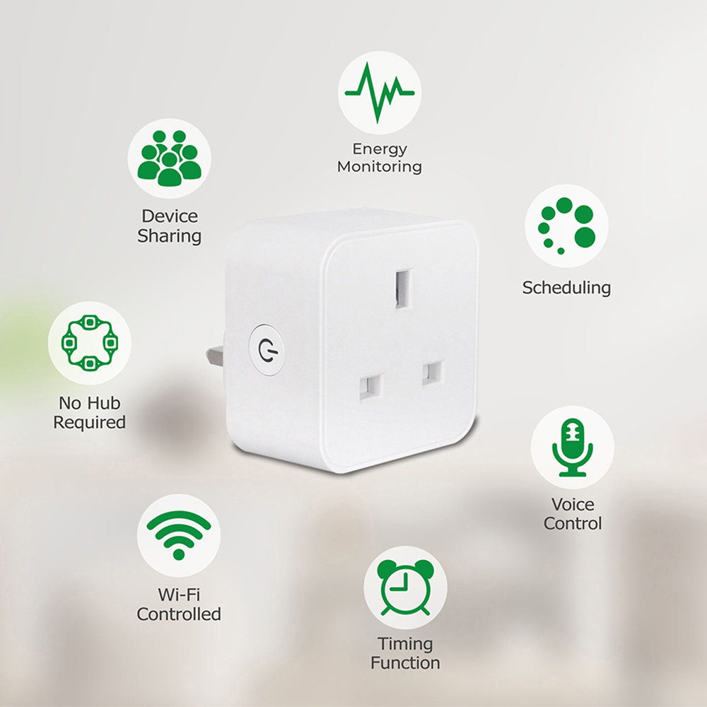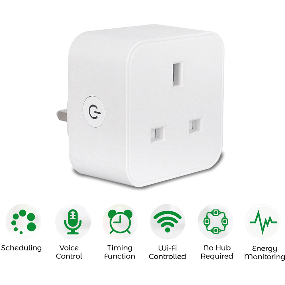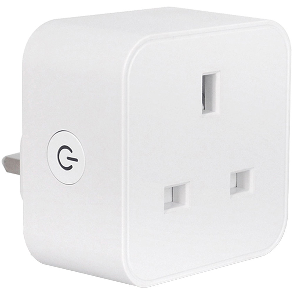 A slimline 13A Wi-Fi smart plug with energy monitor. Designed for UK wall sockets, its compact profile avoids blocking adjacent sockets or interfering with switches, even when used in multi-socket adaptors.