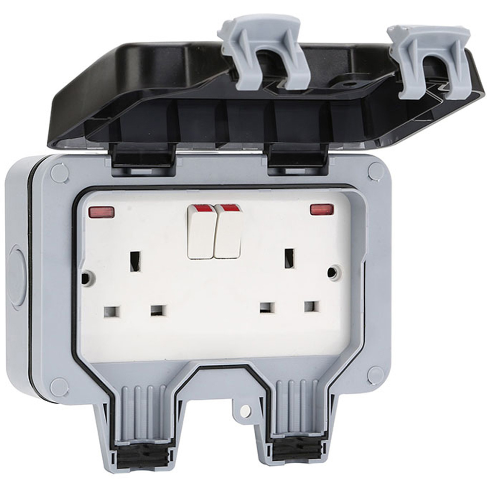 Power up your outdoor projects safely with this twin BS socket and switch. Its IP66 rating ensures complete protection against water ingress, even in the toughest conditions. This robust 2-gang, 13 amp unit features a high-impact, UV-stable housing for lasting durability. Sealed fixing screws and blanking cap cable entries on all four sides provide superior protection. The transparent cover allows easy access, while a protective cushion and seal safeguard plug tops and flexes. Colour-coded terminals with captive screws simplify installation. Rated at 16A, 220-250V (3C rated voltage range: 50V and above, 440V and below), it's built with a PC box and ABS sockets, using tin phosphorus bronze conductive material. Four cable entry holes are provided. Grey finish.