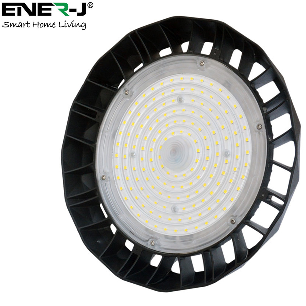 Illuminate your space with the 200W ENER-J UFO LED High Bay light. This high-performance fixture delivers 30,000 lumens (150 lm/W), rivalling a 900W HID/HPS system while slashing energy costs by up to 85%. Its 90-degree beam angle minimises shadows, and smooth dimming (via standard 1-10V dimmer) lets you fine-tune brightness. The impact-resistant die-cast aluminium housing, enhanced by a Lifud driver for superior heat dissipation, safeguards the Sanan 2835 LED chips, ensuring a lifespan exceeding 50,000 hours. IP65 rated for waterproof and dustproof performance, this versatile light is ideal for garages, warehouses, basements, factories, workshops, logistics centres, gyms, stadiums, and more. Conveniently adjust power (200W, 160W, or 120W) via an onboard toggle switch (adjust before installation). Choose from three colour temperatures (3000K warm white, 4000K natural white, and 6500K cool white) – also selected via the switch before installation. Includes a 1-meter output cable and backed by a 5-year warranty. CE, ERP, and RoHS approved.