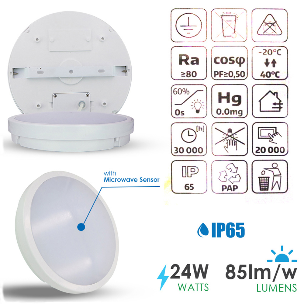 Illuminate your indoor or outdoor spaces with the ENER-J 24W 4000k LED Emergency Ceiling Light. Its 4000k light provides high luminance for lasting use. A built-in microwave presence detector ensures energy efficiency by activating only when motion is detected—even through some walls and doors. Power outages are no problem, the three-hour emergency lighting feature keeps the area illuminated. Producing up to 2200 lumens, the high-output diffuser provides glare-free light with an IP65 rating for versatile indoor/outdoor applications.