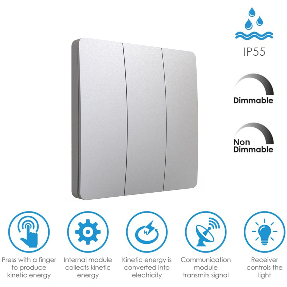 ENER-J 3 Gang Silver Finish Wireless Kinetic Switch with 500W RF Receiver 3 Pack