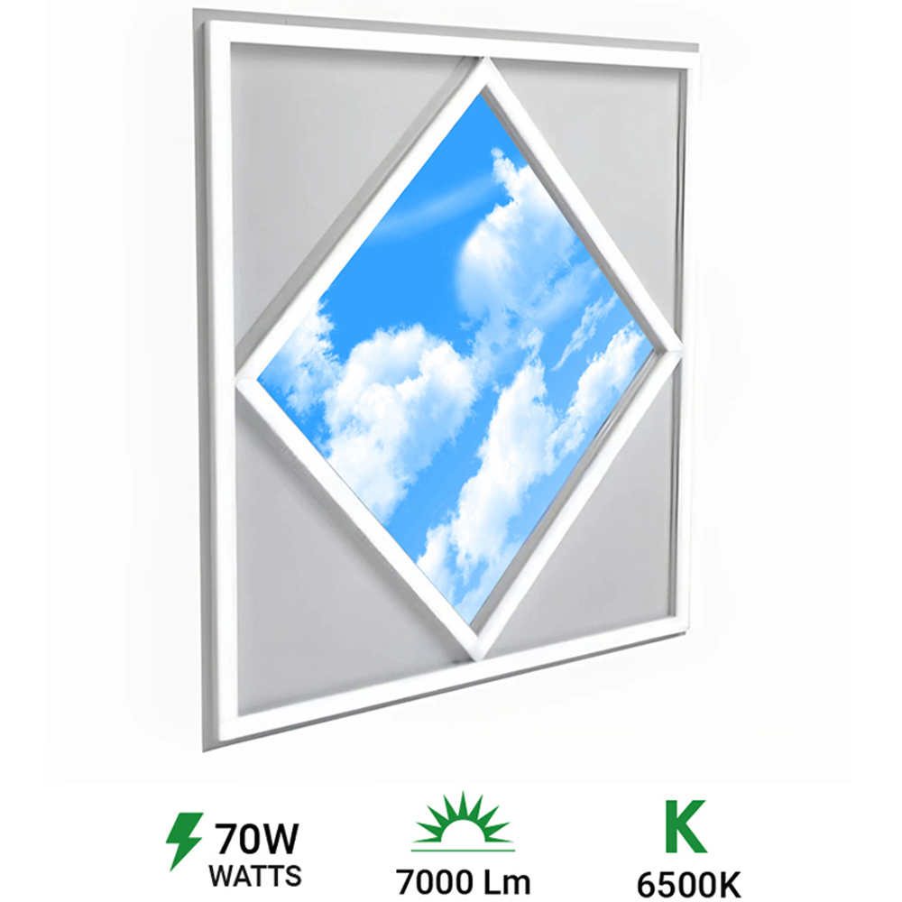 Elevate your space with the ENER-J 600 x 600mm LED ceiling panel light. Its striking diamond frame showcases a calming sky and cloud design, perfect for creating a tranquil atmosphere. This 70W panel delivers 7000 lumens of cool white (6500K) light, making it ideal for offices, waiting rooms, shops, schools, or even your home. A pack of four ensures comprehensive illumination.
