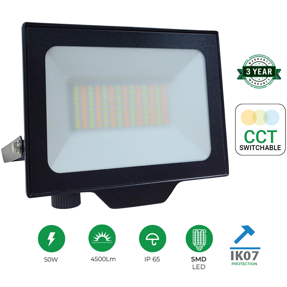 Brighten your outdoor or indoor spaces with this adaptable 50W LED Floodlight. Featuring CCT switchable technology, you can easily adjust the colour temperature between 6000K, 4000K, and 3000K to create the perfect ambience. For added convenience, this floodlight can be equipped with optional sensors to maximise functionality.
