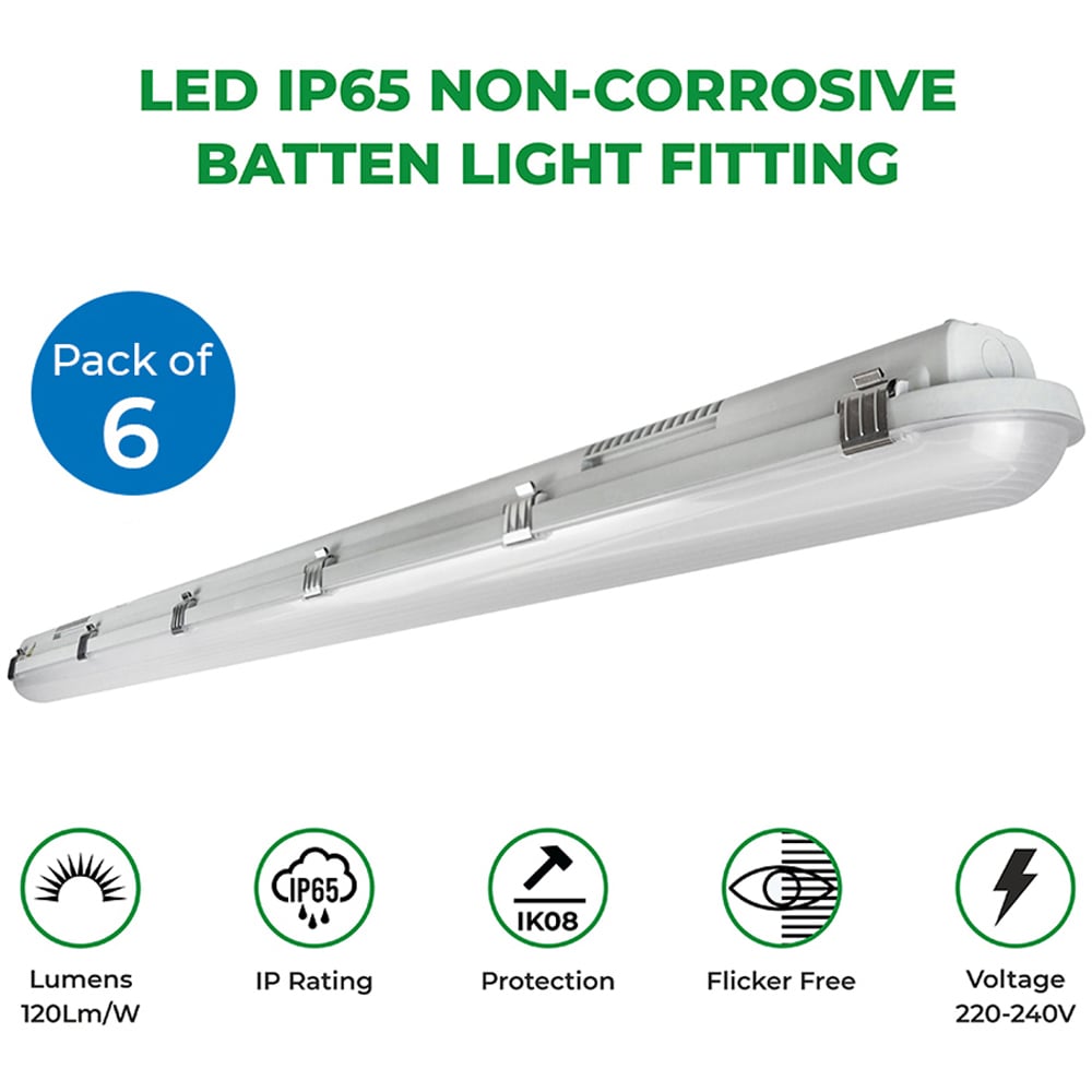 ENER-J 50W 6000K Non Corrosive LED Batten Fitting Light 150cm 6 Pack