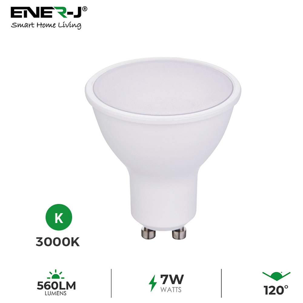 Transform your space with the Ener-J 7W GU10 LED Lamp. Delivering 550 lumens of warm white (3000K) light, this energy-efficient bulb provides excellent colour consistency and high-quality illumination. Enjoy a lifespan of up to 20,000 hours, making it a long-lasting and eco-friendly choice. Simple to install as a direct replacement for traditional GU10 halogen bulbs – no transformer required.