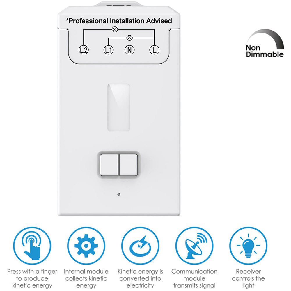 Effortlessly control two lighting circuits with the ENER-J 2 Way 500W RF Receiver. This space-saving dual receiver offers wireless operation, simplifying your lighting setup. Enjoy a reliable range of up to 20 metres indoors and an impressive 80 metres outdoors (environmental factors may affect range). Pair it with your wireless kinetic switches (sold separately) for seamless control. Its slim, robust design and straightforward installation make it perfect for various applications, while built-in safety features provide peace of mind.