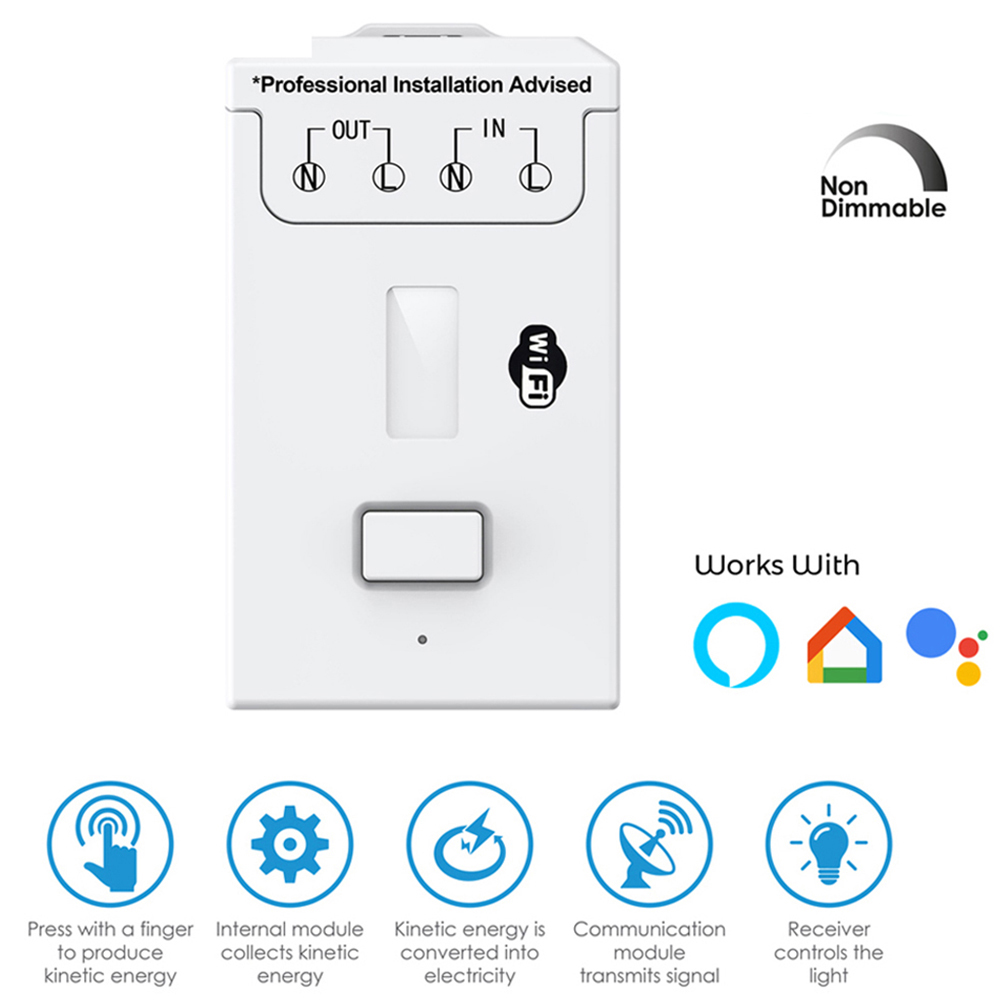 Effortlessly control your lighting with the ENER-J 3-gang wireless kinetic switch and three 500W RF+Wi-Fi non-dimmable receivers. Say goodbye to complicated wiring, batteries, and wall drilling – this kinetic switch is self-powered for a truly green solution. Control your lights easily via RF with the switch, or connect to your Wi-Fi network using the ENERJSMART app for remote access and voice control with Alexa, Google Home, Siri, or Apple Watch. Create schedules to conserve energy and group multiple receivers together for convenient scene settings. Enjoy the ultimate in lighting control and energy efficiency.