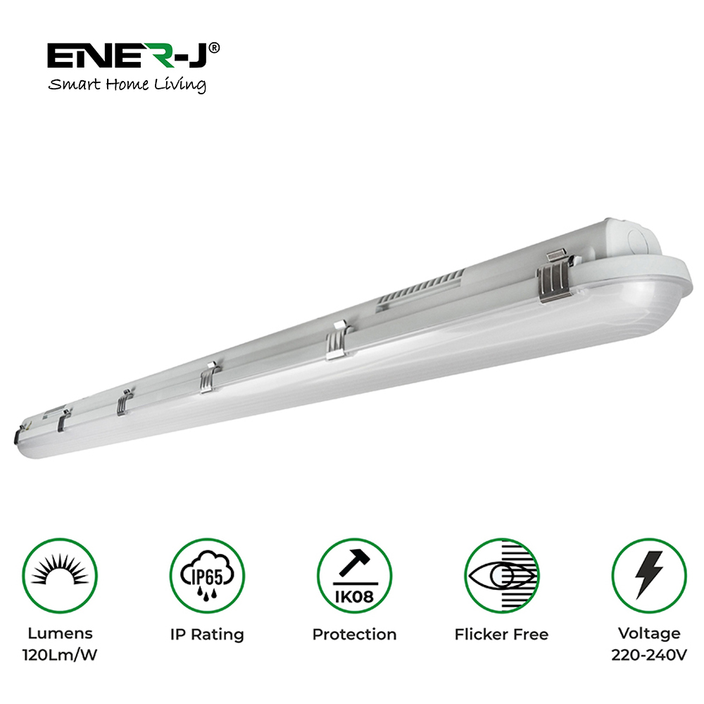 Illuminate your outdoor spaces with the ENER-J 150cm LED Batten. Ideal for car parks, factories, warehouses, gardens, and patios, this robust light boasts an IP65 rating for complete weather resistance. The high-quality LED and power driver deliver impressive energy savings – up to 80% compared to fluorescent lamps. Producing 4800 lumens at 120 lumens per watt, this 40-watt batten offers bright, consistent illumination with minimal energy consumption. Enjoy a lifespan of up to 20,000 hours. Shatterproof, shockproof, and free from harmful UV and mercury, this non-dimmable batten provides instant 0-100% brightness, with no flickering. Heavy-duty stainless steel fixing clips (compatible with BESA boxes) ensure easy installation. Dimensions: H 187 x W 1530 x D 242mm. Input Voltage: 230V.