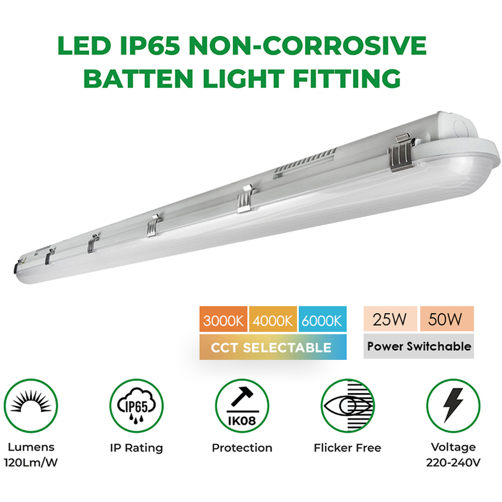 Transform your lighting with this adaptable, non-corrosive LED fitting. Boasting a 1.5m length, this versatile fixture lets you select both power and colour temperature. Effortlessly switch between 25W and 50W outputs, and fine-tune the light from a cool 6500K, through 4000K, to a warm 3000K. Its IP65 and IK06 ratings ensure durability in diverse settings. Benefit from energy-efficient illumination – a remarkable 120 lumens per watt – all while enjoying shatterproof, shockproof construction, free from harmful chemicals.