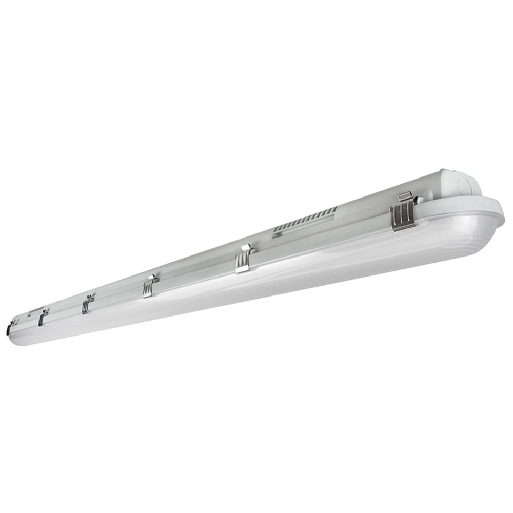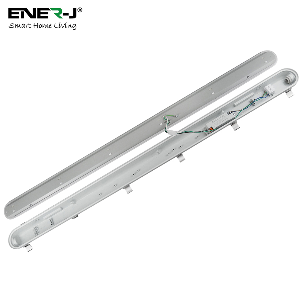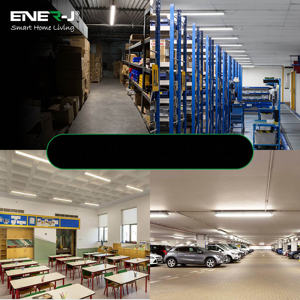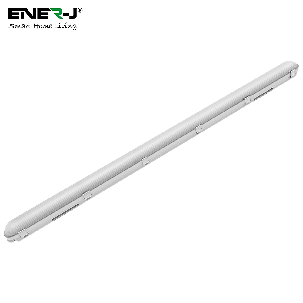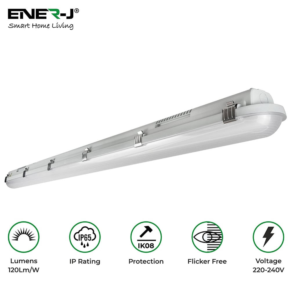 Keep the lights on, even during a power outage, with this 150cm ENER-J LED emergency batten. Its built-in battery backup ensures continuous illumination, while its impressive 6000 lumens output from only 50 watts makes it incredibly energy efficient – saving you up to 80% on electricity compared to fluorescent lamps. The IP65 rating provides waterproof and dustproof protection, ideal for various outdoor locations, including car parks, factories, warehouses, workshops, gardens, attics, and patios. This robust, shatterproof and shockproof batten is mercury and UV-free, offering 120 lumens per watt and a remarkable 20,000-hour lifespan. Enjoy instant, flicker-free lighting with 0-100% dimming in under a second. Secure mounting is simple thanks to the included lockable stainless steel fixing clips designed for BESA boxes. CRI: Ra 80, CCT: 6000K, Input Voltage: 230V, Dimensions: H 187 x W 1530 x D 242mm. Non-dimmable.