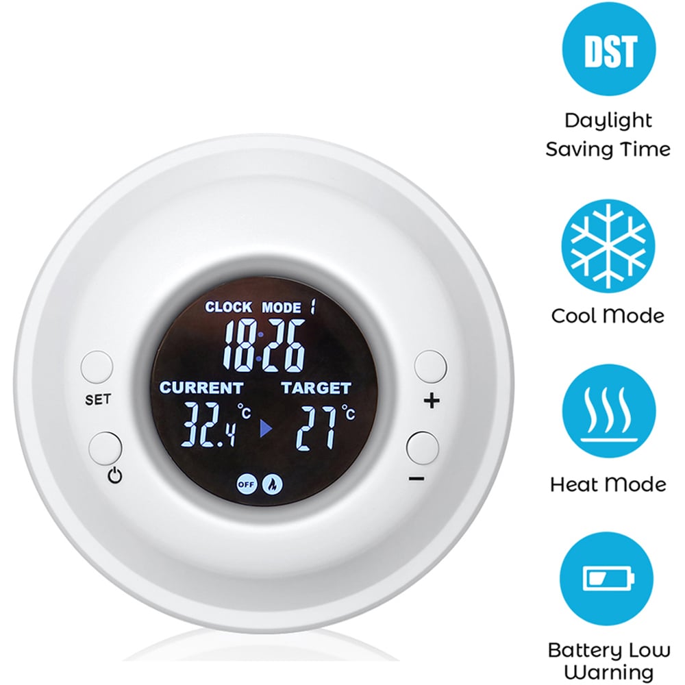 Effortlessly manage your heating and cooling with the ENER-J Max 3680W RF Thermostat. This wireless thermostat timer offers both convenience and energy savings. Its large LCD screen boasts a selectable white or green backlight, clearly displaying the time and incorporating a Daylight Saving Time option. Seamlessly switch between heating and cooling modes. The thermostat automatically regulates your plug-in devices, optimising energy consumption and reducing your electricity bills. A backup battery and low battery warnings ensure uninterrupted operation. It is suitable for infrared heating panels and includes a UK plug.