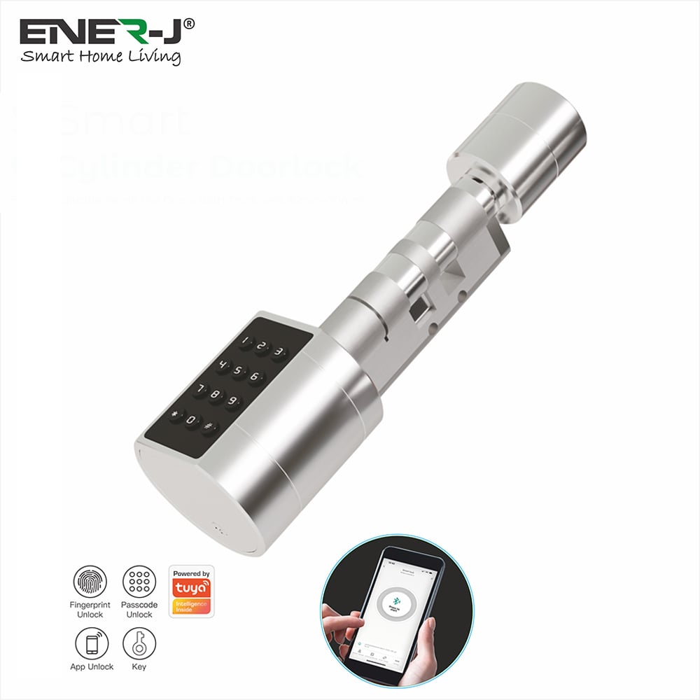 Secure your home with the Ener-J Smart Adjustable Cylinder Doorlock's versatile unlocking options: digital keypad, Bluetooth (ENERJSMART app), fingerprint scan, and traditional key. Monitor access remotely via the app, tracking user activity and entry times. Designed for doors 35-70mm thick with a standard 2-1/8" diameter deadbolt hole, this lock includes rubber spacers for a secure fit. The stylish silver finish and IP55 weather rating ensure lasting performance. Ideal for diverse locations, from homes and apartments to Airbnb rentals, HMOs, offices, and shops. Requires AAA batteries (not included).