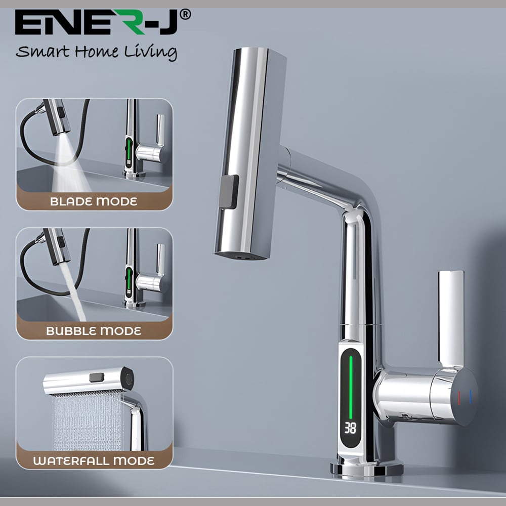 Ener-J Single Hole Chrome Pull Out Waterfall Kitchen Tap with LED Display