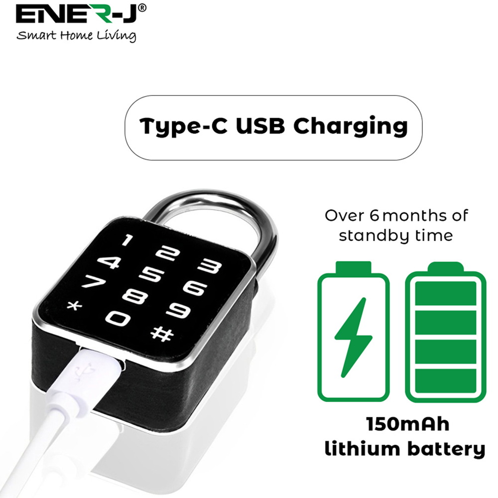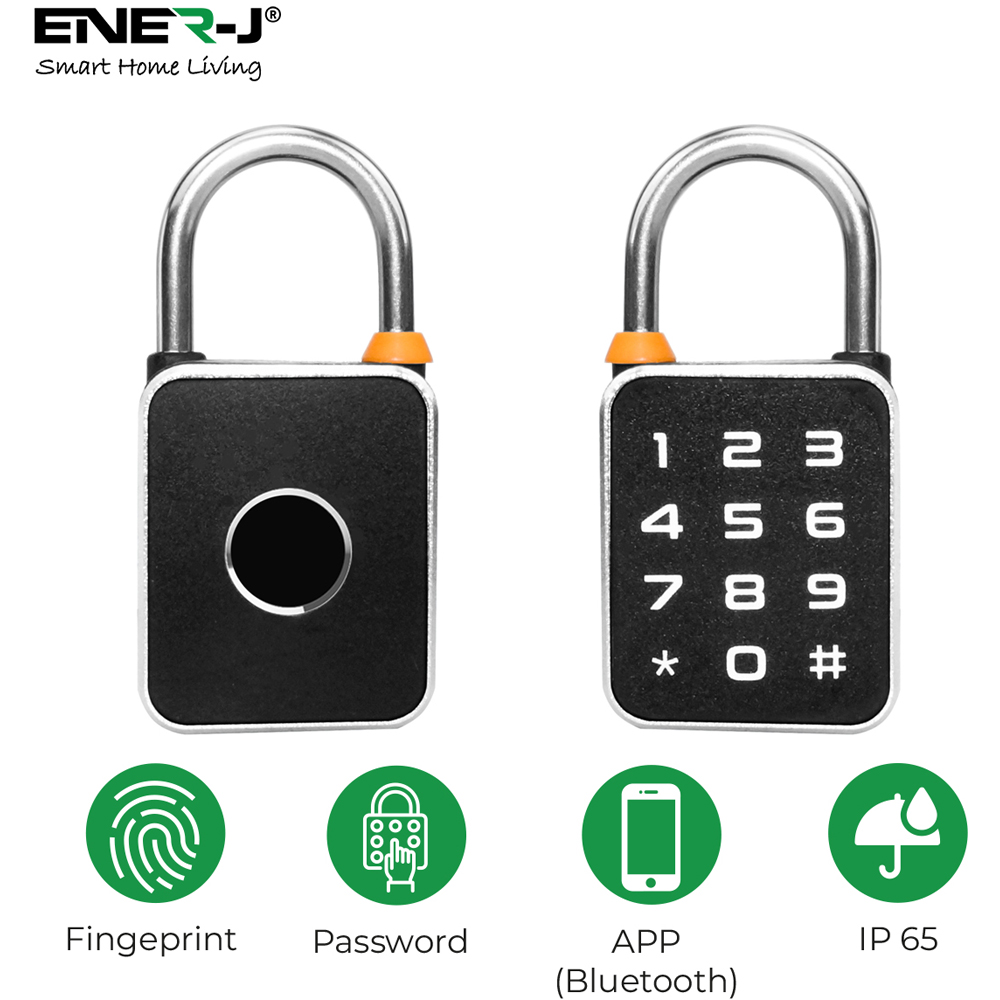 The Ener-J Smart Fingerprint Padlock: Experience the ultimate in security and convenience. This robust lock uses cutting-edge technology to protect your valuables, offering fingerprint scanning, digital keypad entry, and Bluetooth app control. Ideal for homes, gyms, travel, and more, it secures keys, and other important items. Store up to 50 fingerprints and 100 passwords for flexible access management. Its zinc alloy construction and 7mm locking arm provide superior protection against the elements and tampering, with reliable operation from -20°C to 60°C. The anti-snooping virtual password feature adds an extra layer of security.