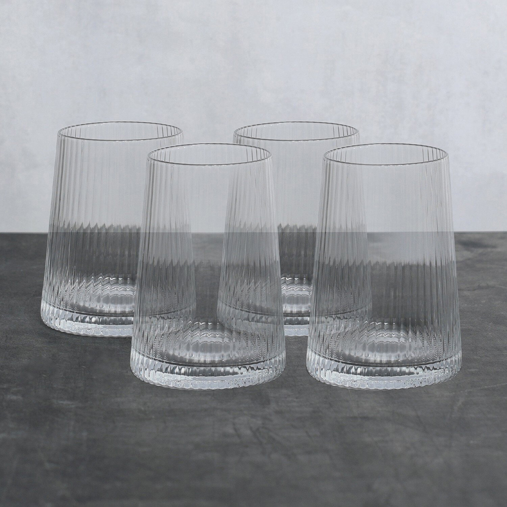 Add a touch of vintage charm to your table with this set of four Enya ribbed tumblers. Their conical shape and unique ribbed detailing offer a contemporary twist on a classic design, perfect for everyday use or entertaining. Ideal for parties and events, these glasses are ready to hold your favourite drink.