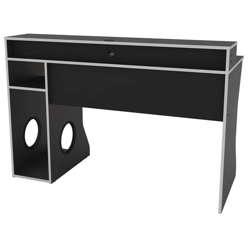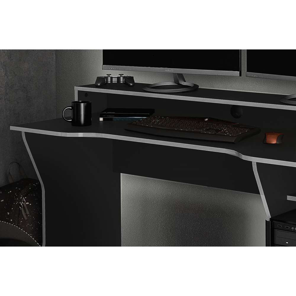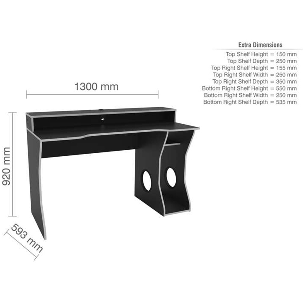 Elevate your gaming setup with the Enzo Gaming Computer Desk. This stylish desk boasts a spacious top shelf, easily accommodating two large monitors, while the generous ergonomic work surface below provides ample room for your keyboard, mouse, controllers, and games. Clever storage is built-in, the base features a compartment for your computer, complete with a ventilation hole, plus a handy shelf for extra games or controllers. Finished in a sleek black with crisp white trim, this desk is a stunning addition to any home or gaming space. Simply wipe clean with a soft, dry cloth for effortless maintenance.