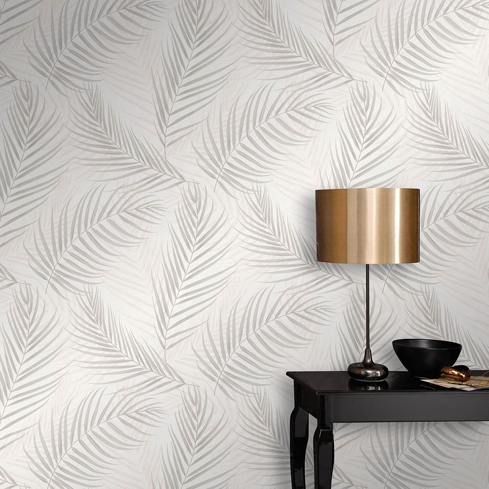 The Erismann Modern Palm Leaves White Wallpaper offers elegance and modern sophistication. Delicate palm leaves, set against a textured vinyl background, are subtly highlighted with metallic accents for a contemporary touch. Paste-the-wall application simplifies installation and removal, while the high-quality, lightfast vinyl material guarantees a refined and stylish look that will endure.