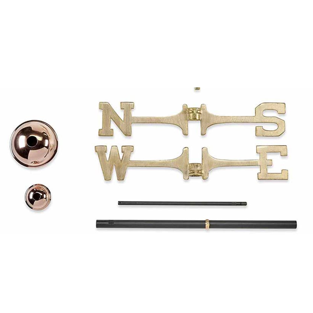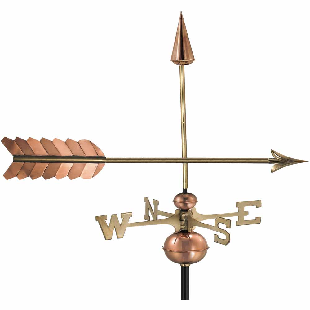 Add a touch of classic charm to your home or outbuilding with the Farmhouse Arrow Weathervane. Its decorative features and spacer balls are crafted from polished copper, hand-brazed for lasting quality. The NSEW cardinal points are polished brass, affixed to a durable powder-coated black steel rotation rod. Naturally, the polished copper will develop an attractive patina, eventually turning verdigris with age, applying a clear lacquer can help preserve its shine. The polished brass will also discolour over time. For longer life, we recommend protecting the steel rod with Hammerite. Every weathervane comes complete with an eave bracket—a 125mm (5”) projection with a 10cm square mounting plate. Approximate Dimensions (cm): Overall: 58.5 (W) x 89 (H), Arrow: 58.5 (W) x 3.5 (D) x 38 (H.