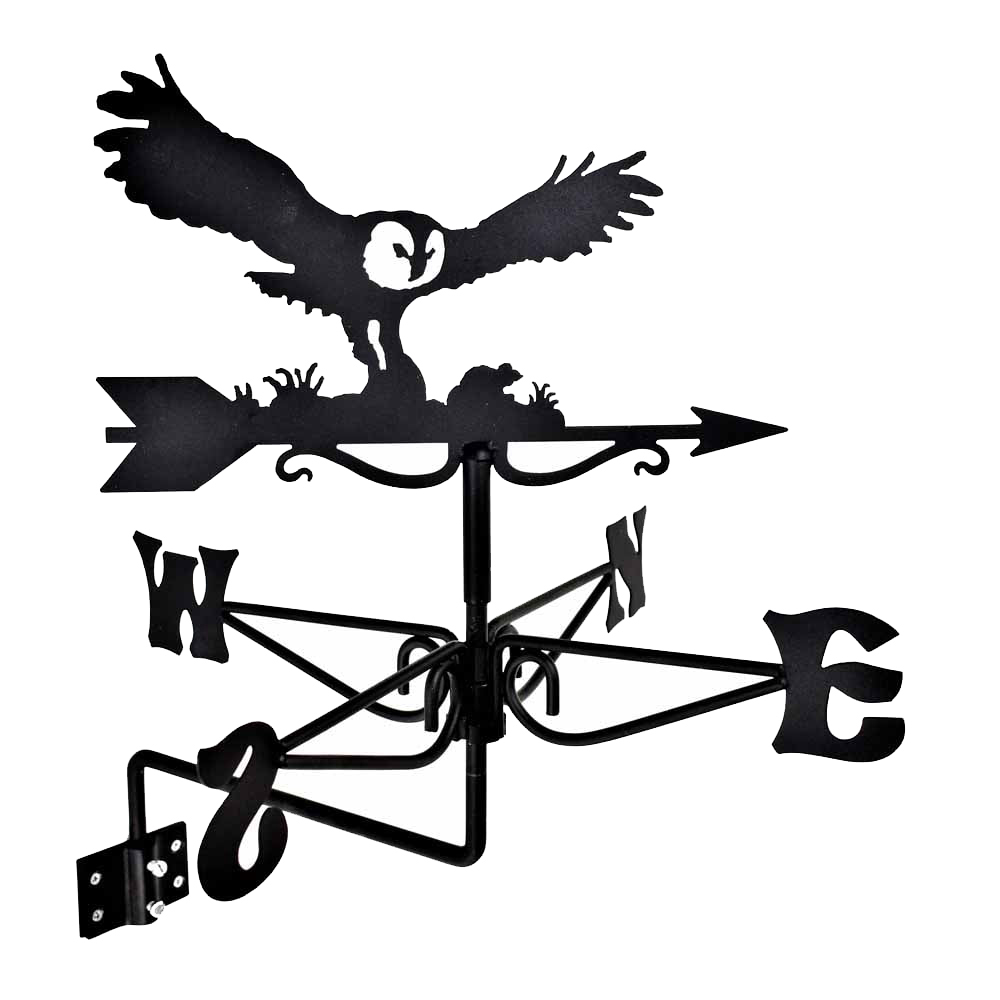 This charming Owl and Mouse Mini Weathervane adds whimsical style and practical function to your garden. Ideal for sheds, outbuildings, fence posts, or gazebos, it accurately indicates wind direction. Made from sheet steel with a durable black powder-coated finish, this weathervane is built to last. To keep it looking its best, touch up the paint with Hammerite occasionally. Installation is easy thanks to the included universal fixing kit: a 10.5 x 4.9cm backplate, Z-bracket for horizontal/eaves mounting, L-bracket for vertical mounting, and screws suitable for wood or masonry. Complete with assembly instructions and a decorative gift box, this delightful weathervane depicts an owl soaring above a mouse. Approximate Dimensions (cm): Overall: 38 (W) x 48 (H), Owl: 31.5 (W) x 22.5 (H.