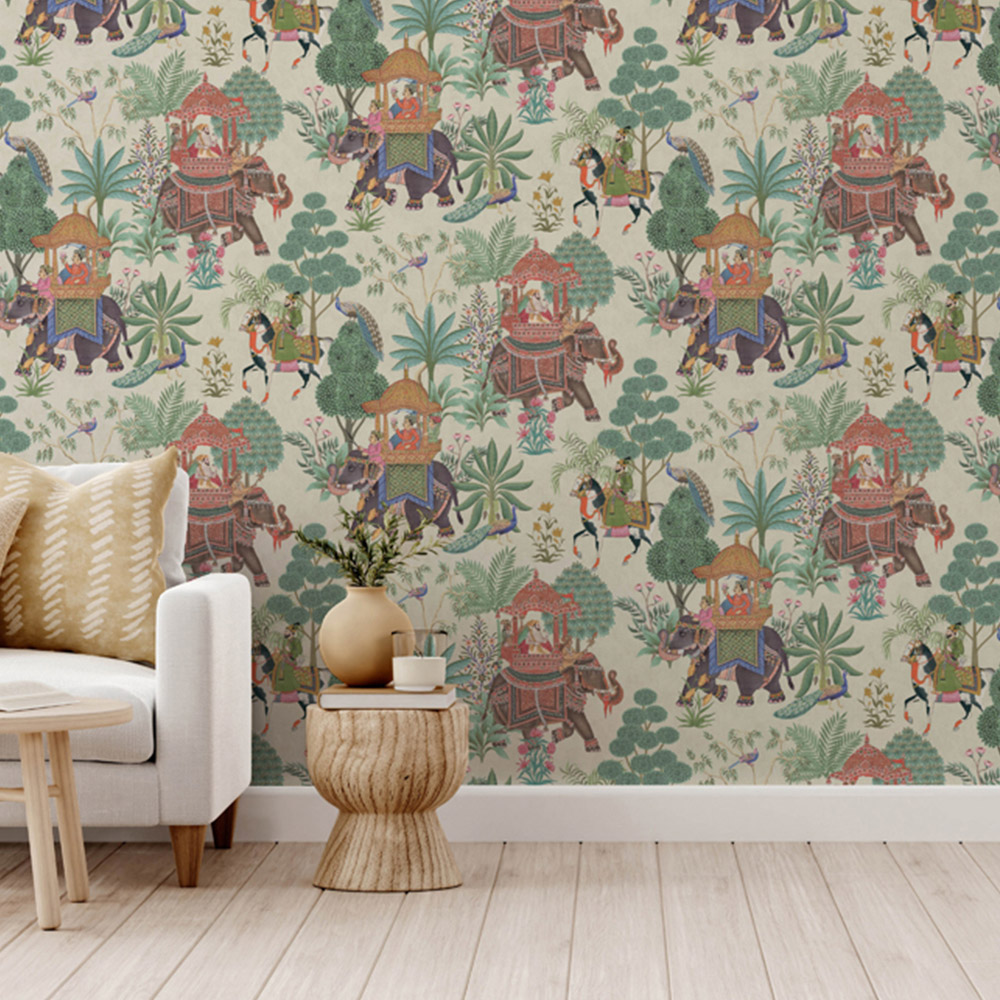 Unfurl a tapestry of wonder onto your walls with our captivating new wallpaper Emperor's Garden. Inspired by the Mughal Dynasty, this spellbinding design transports you to the heart of an ancient Indian paradise, where majestic peacocks and jewel-adorned elephants roam amongst the fragrant gardens. Emerald greens, sapphire blues and touches of gold weave together to create this wonderous world. A talking point in any room, its rich, jewel-toned palette and enchanting details, will instantly add theatre and opulence to your interior.