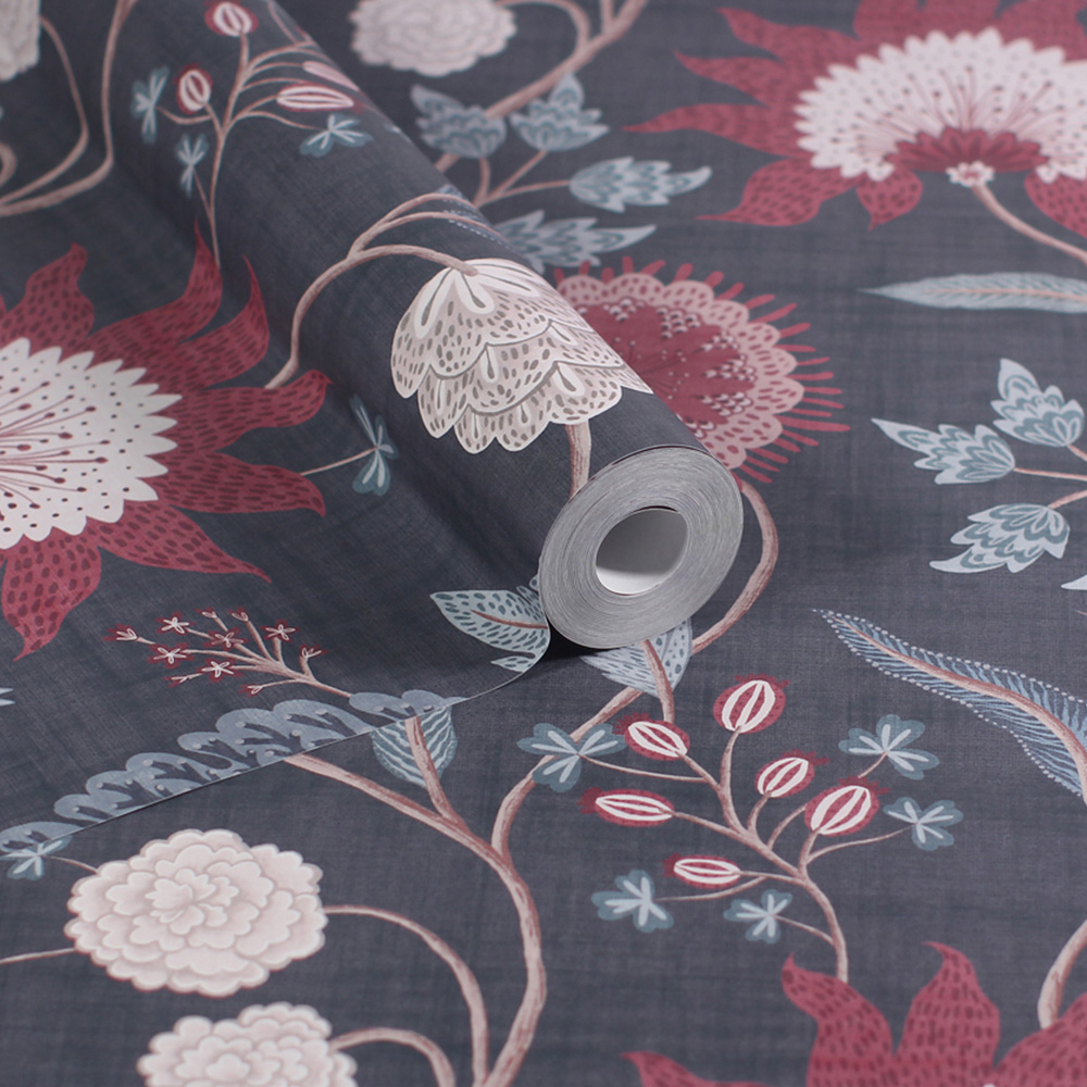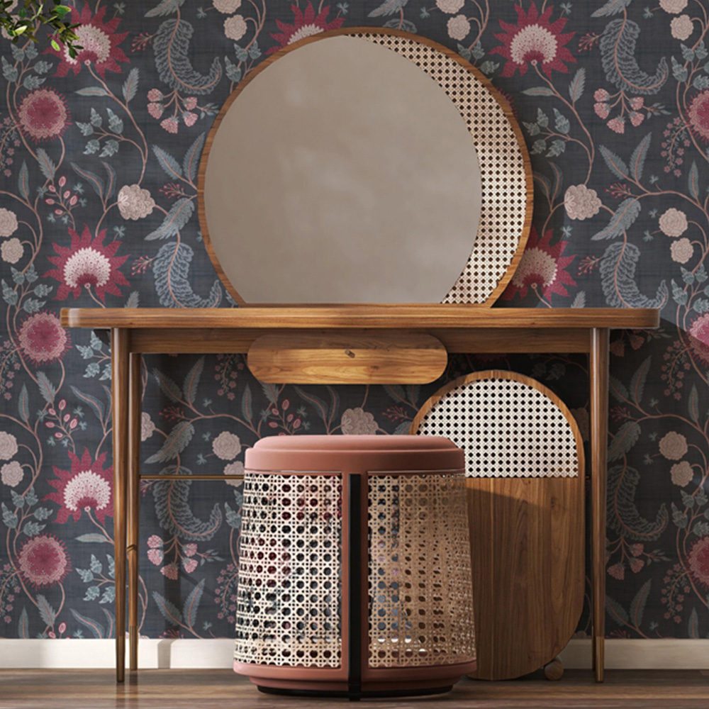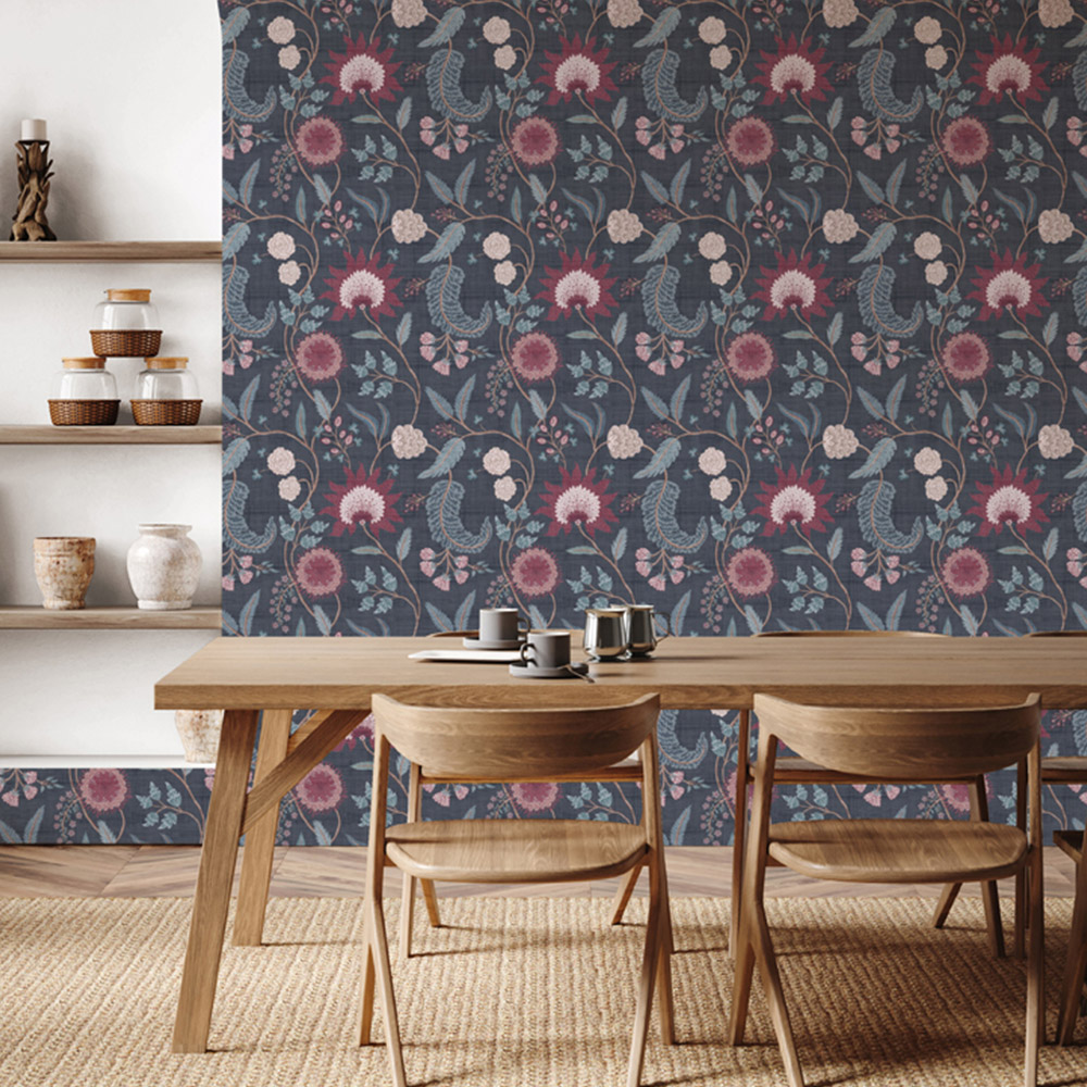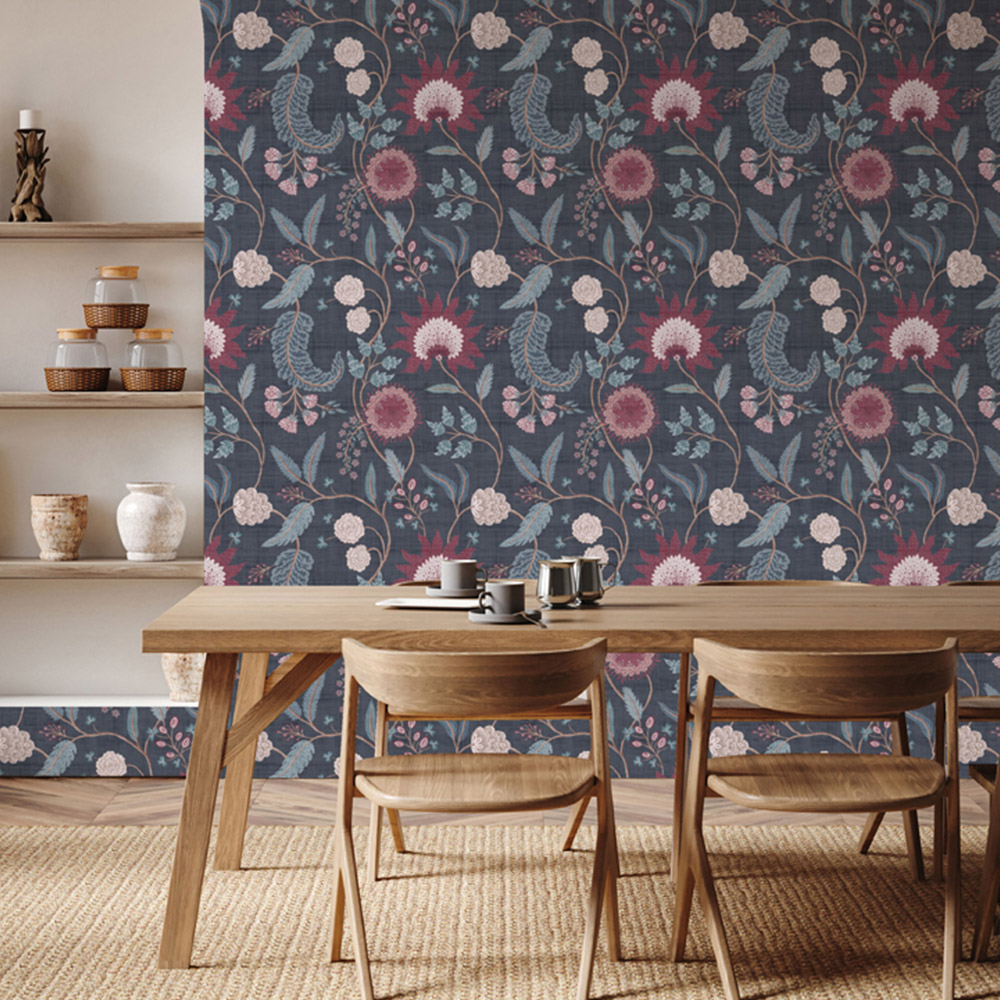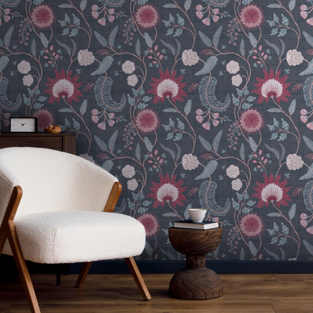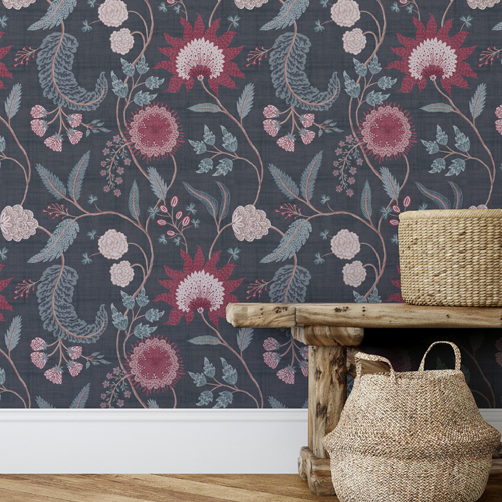 Let your walls become a canvas for timeless elegance with our Fable Trail design. Hand-crafted floral elements, reminiscent of Jacobean grandeur, intertwine with a delicate folk trail, crafting a rich tapestry that sings of heritage and beauty. The beautiful palette of navy, soft teal and deep berry creates a dramatic take on a more traditional style. With a nod to both folk and bohemian influences this design truly brings craftmanship and beauty to the fore..