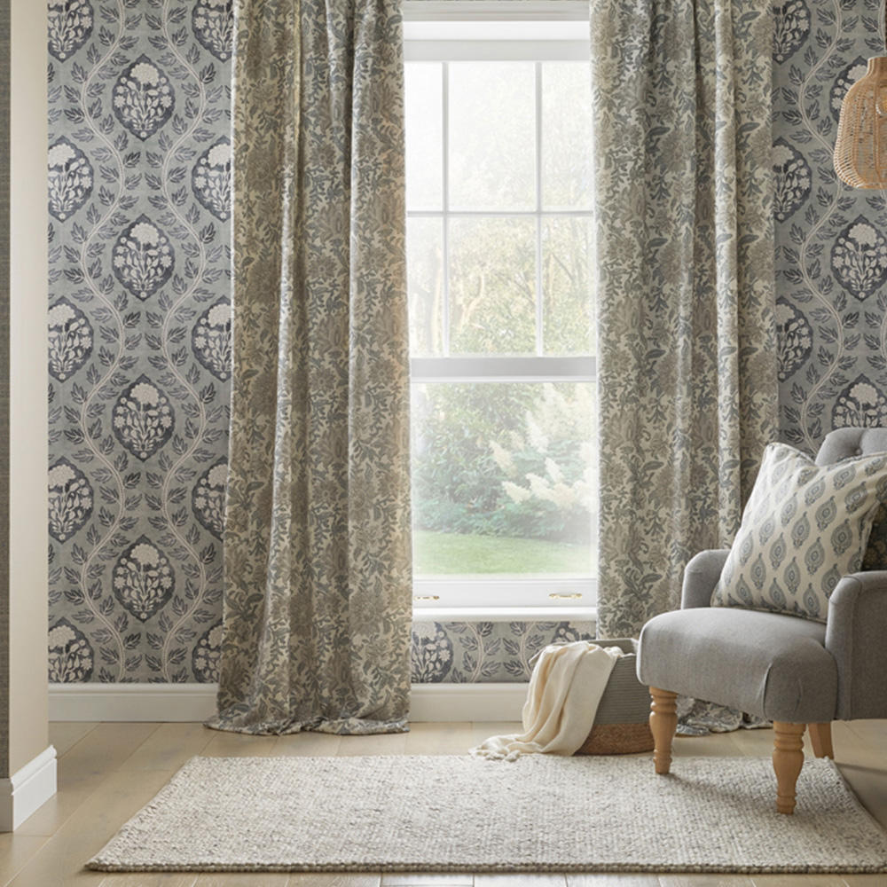 Inspired by archives of historical block prints, this beautiful floral cartouche design is sure to add an artisanal finish to your walls. In soft blue inky hues this voluptuous design will create depth and character in any space. The Persian inspired borders construct a wonderful ogee shape with a floral focal point that transforms into a damask trellis. Its authentic folk charm is further enhanced through the use of a textured background. Floral Ogee is a truly stunning design which will elevate any bedroom, dressing room or living space.
