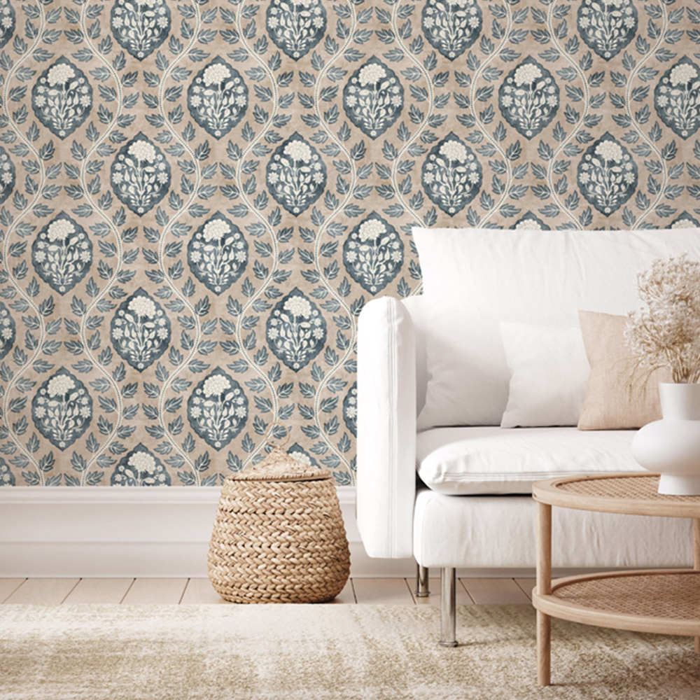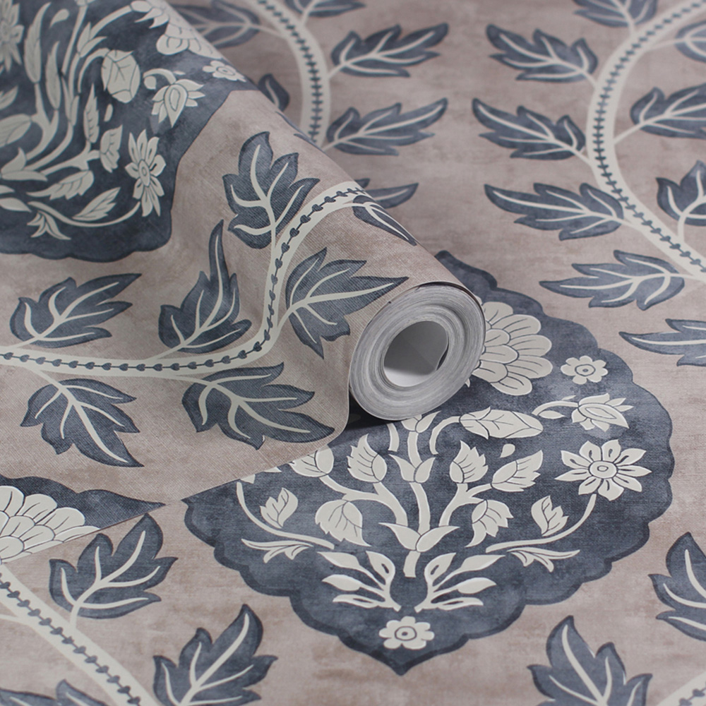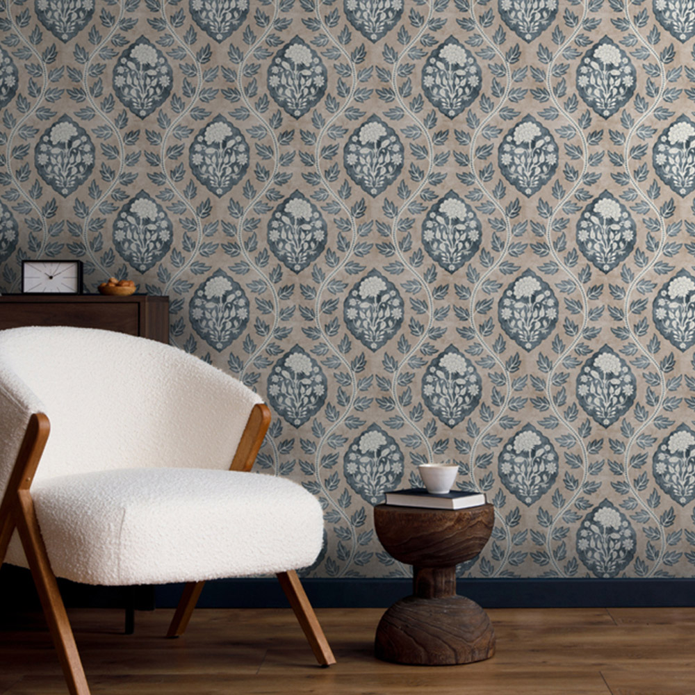 Inspired by archives of historical block prints, this beautiful floral cartouche design is sure to add an artisanal finish to your walls. In neutral stone and inky blue hues this voluptuous design will create depth and character in any space. The Persian inspired borders construct a wonderful ogee shape with a floral focal point that transforms into a damask trellis. Its authentic folk charm is further enhanced through the use of a textured background. Floral Ogee is a truly stunning design which will elevate any bedroom, dressing room or living space.