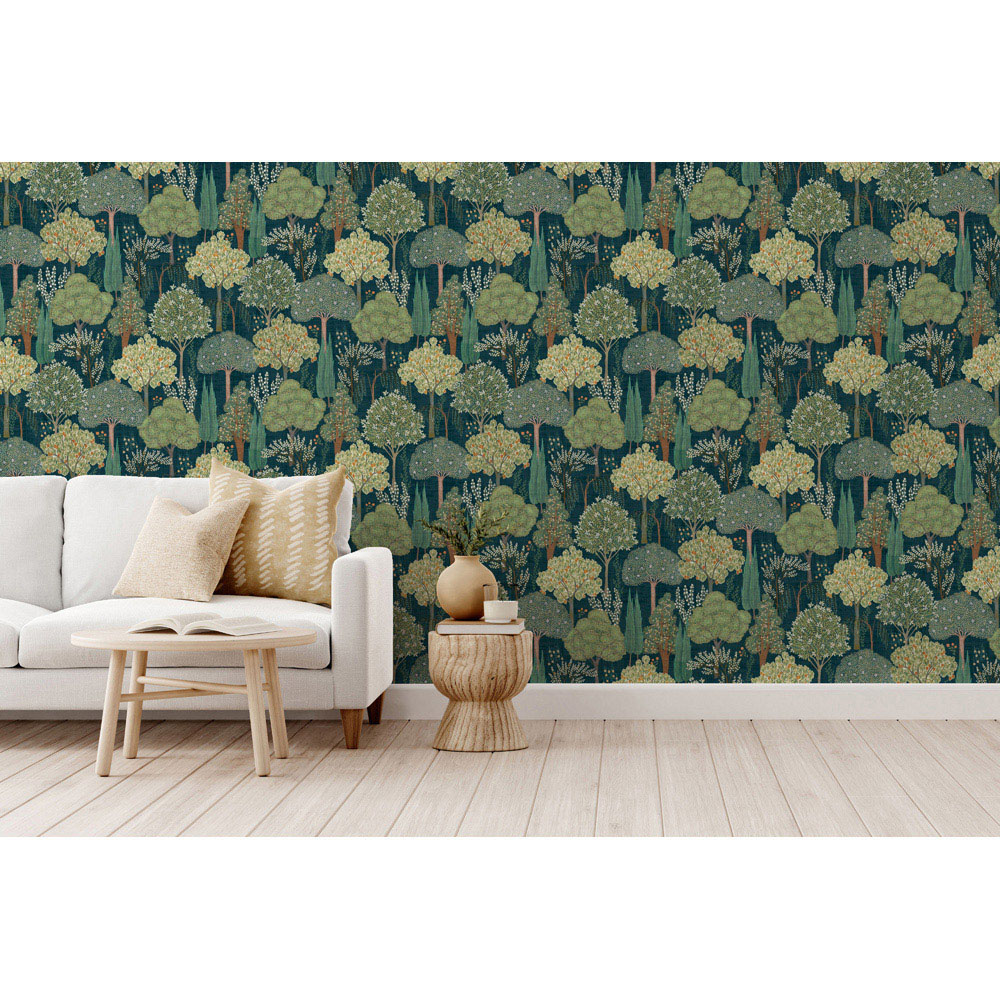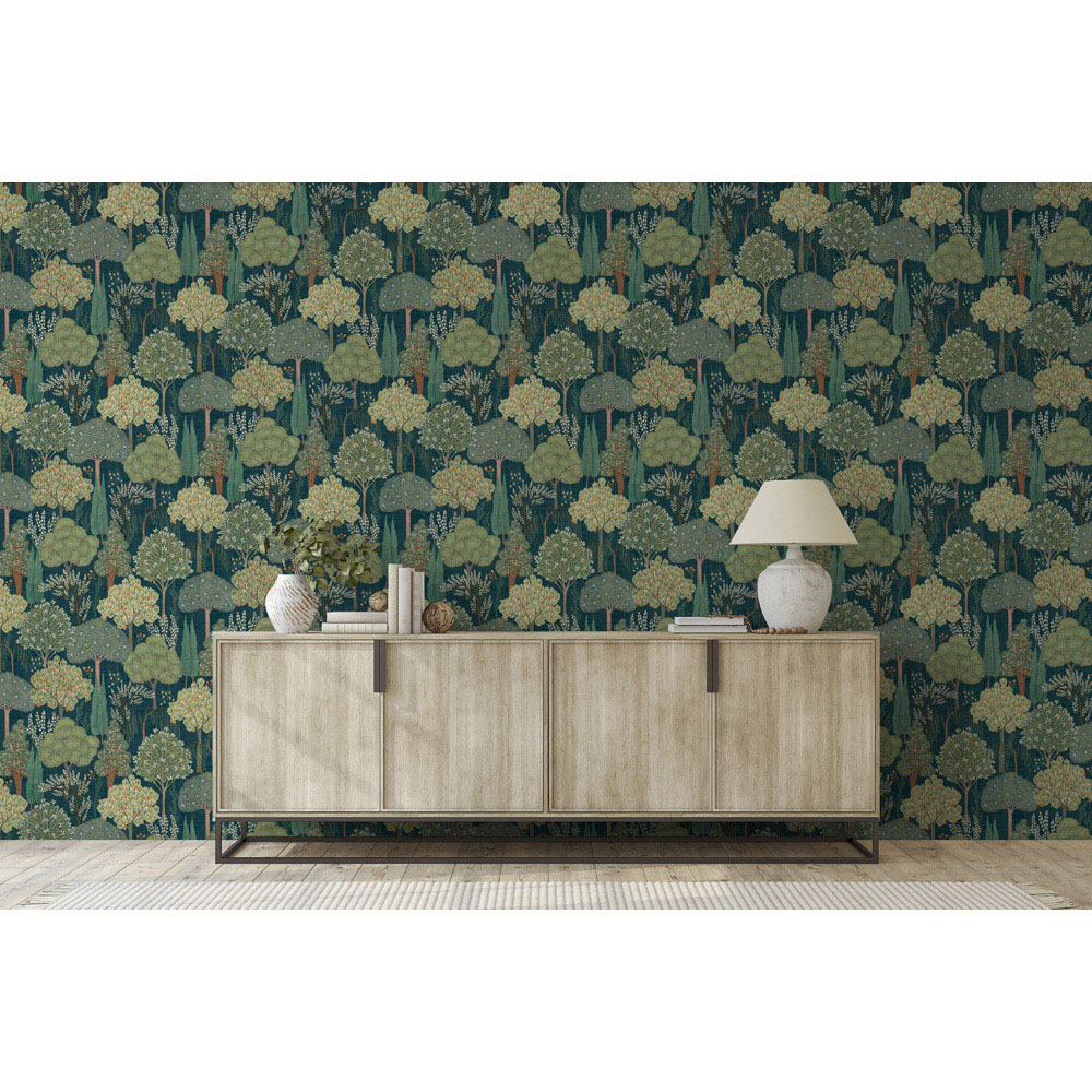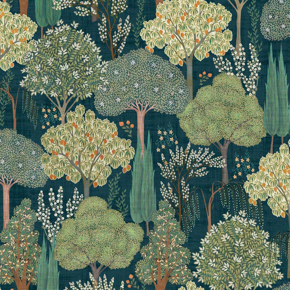 Escape to the tranquillity of a Persian paradise with Esselle Home Persian Oasis Navy and Green Wallpaper. Inspired by the verdant havens of the Middle East, this design invites you to wander beneath fragrant mango trees, past vibrant flora and weeping willows, into the secret world of the Mughal empire. The intricate details and layered foliage create a sense of depth and dimension, with the rich colour palette making even small spaces feel more expansive and inviting.