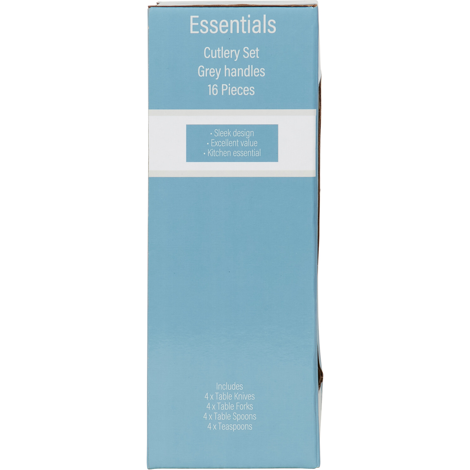 Kit out your dining space with this 16-Piece Essentials Cutlery Set, complete with grey handles. Perfect for a family of four, this set includes everything you need: four table knives, four table forks, four tablespoons, and four teaspoons. Each piece features a sleek design complemented with a grey handle for a stylish look. Simple, elegant, and ready to create a lovely dinner table arrangement.