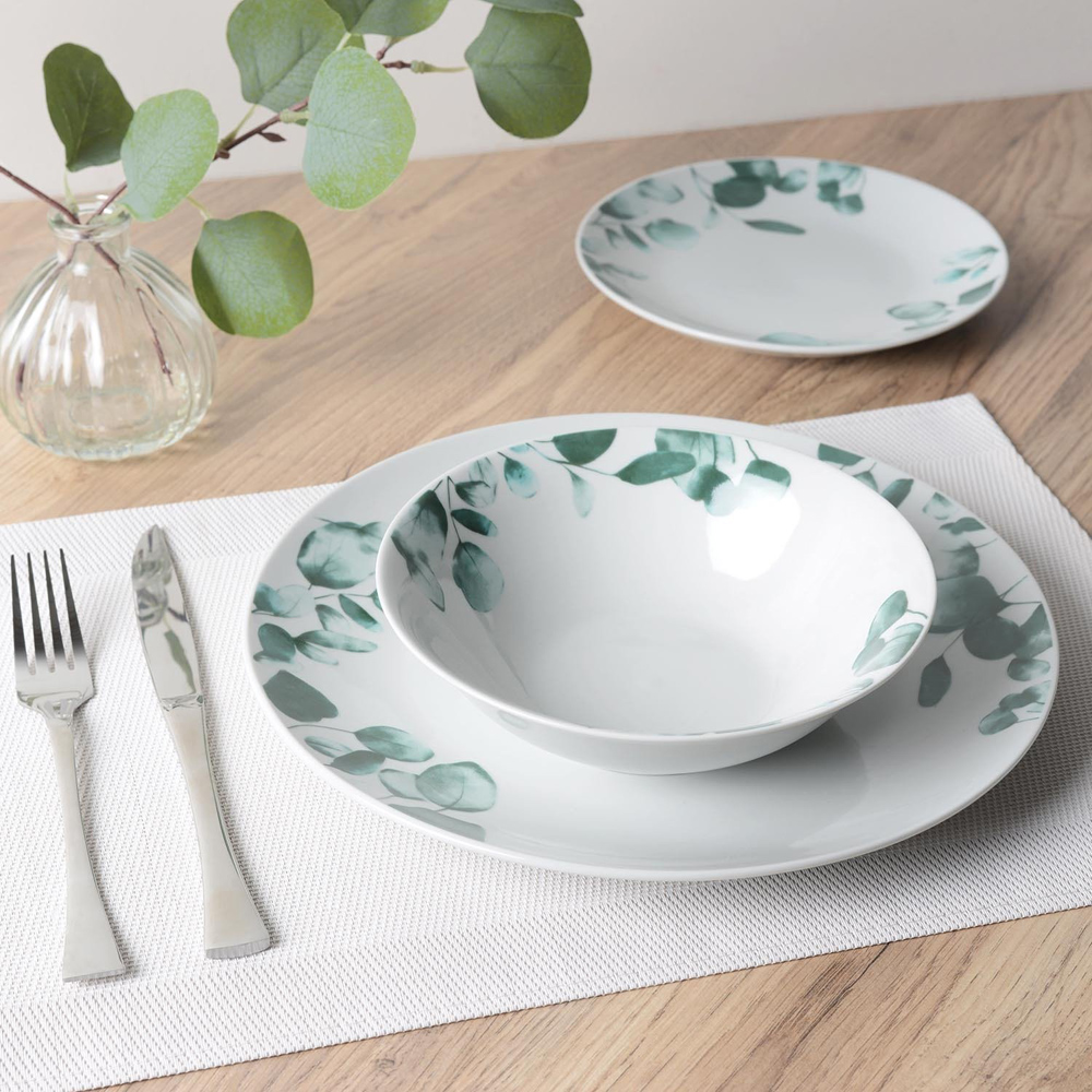 Elevate your dining with this 12-piece Eucalyptus Dinner Set. A blend of classic shapes and a contemporary eucalyptus leaf design delivers an elegant, on-trend look perfect for everyday meals or special occasions. This stunning collection, comprising dinner plates, side plates, and bowls, adds a touch of modern sophistication to any table setting, transforming even the simplest meal into a memorable event.