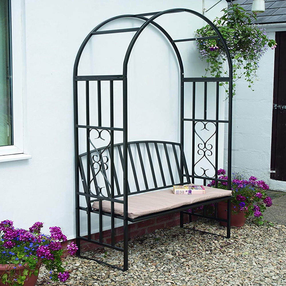 Elevate your outdoor haven with this striking 3.7 x 6.9ft black metal garden arbour and bench. Its powder-coated metal construction ensures lasting durability, providing robust support for climbing plants to thrive and create a captivating romantic atmosphere. This elegant trellis arch is a show-stopping addition to any garden, instantly enhancing its ambience. The integrated bench, with a seat height of approximately 1.3ft, offers a comfortable resting spot to fully appreciate your surroundings. Please note: cushion not included.